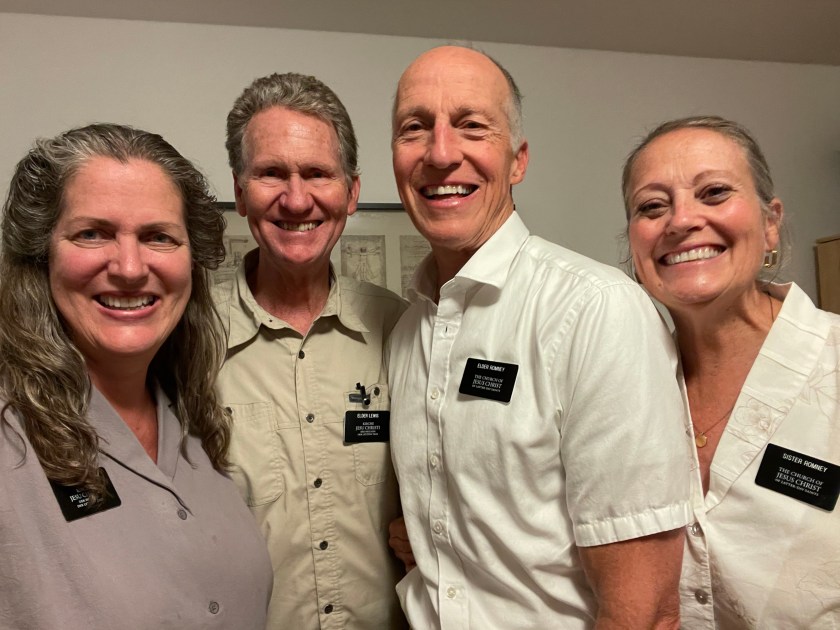 These first few evenings, dinner is provided for us by other couples who volunteer to feed us (until we get our feet under us). Tonight we had dinner with Brent and Ella Romney, good friends of ours from the BYU Alumni Association. Brent serves here as an In Field Representative (IFR) to several mission presidents (that means he’s their lifeline if they have any questions about anything). It was really fun to spend the evening with them.