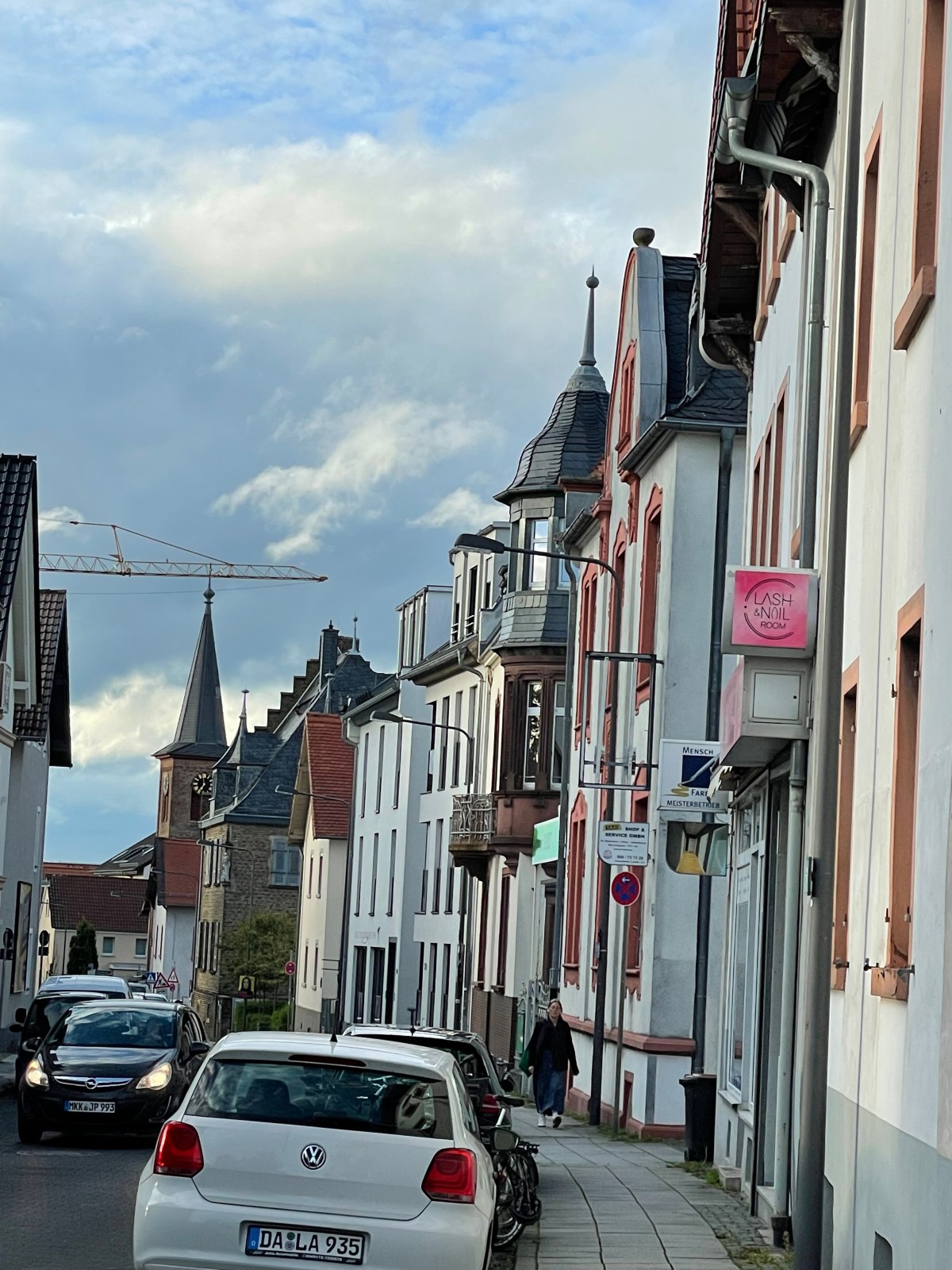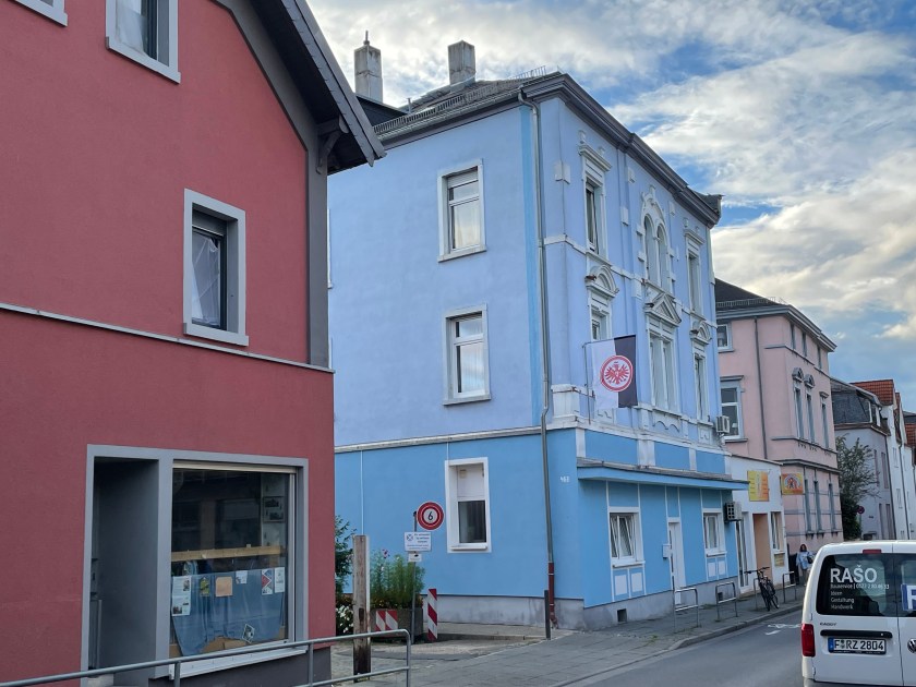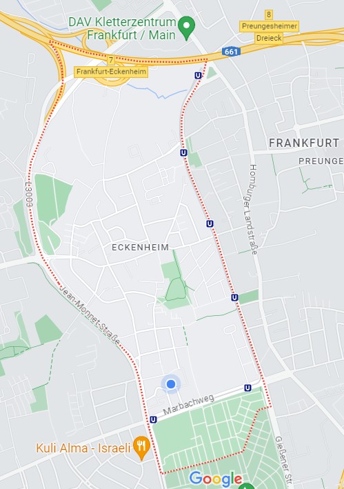We went out for a walk this evening during a break in some rain storms. We live in a part of Frankfurt called Eckenheim. Eckenheim is called a quiet village in the city. We live where the blue down shows below.