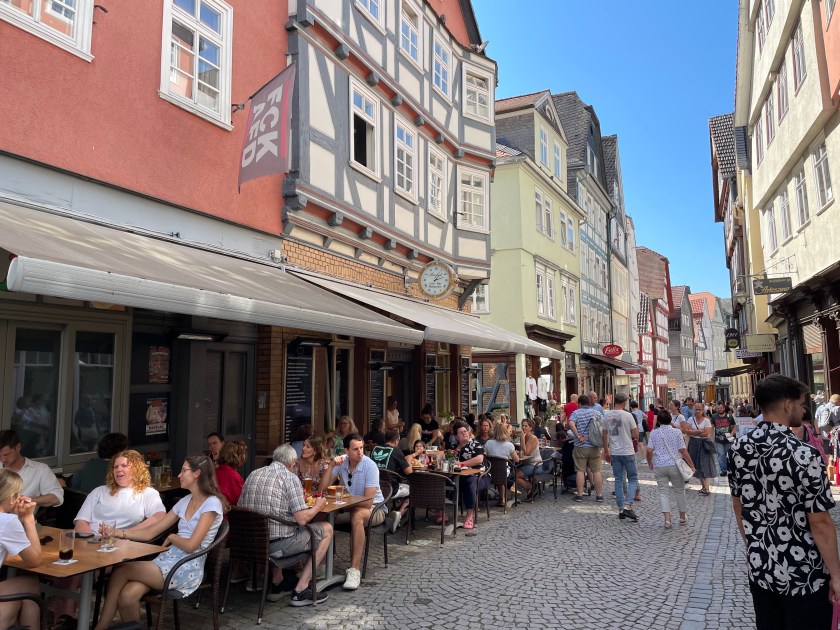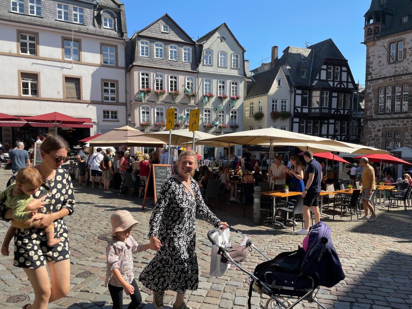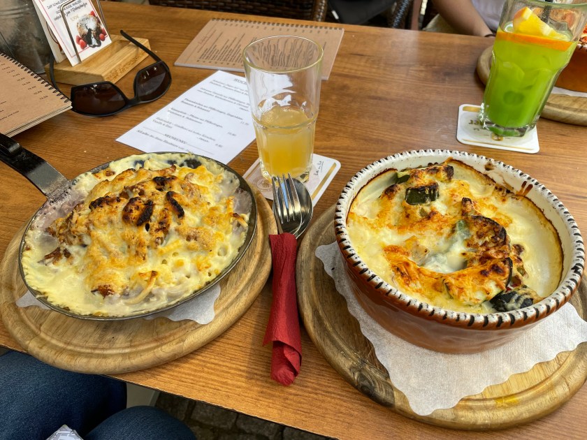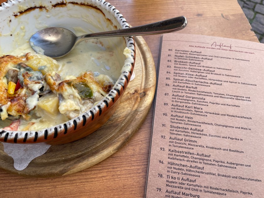 After walking past all the cafes, we picked the one that looked the most delicious. I think we picked well! I’ve never had such good food here. Marburg is famous for these deep dish baked meal called Auslauf. There are as many to choose from as there are pizzas in a pizza shop.