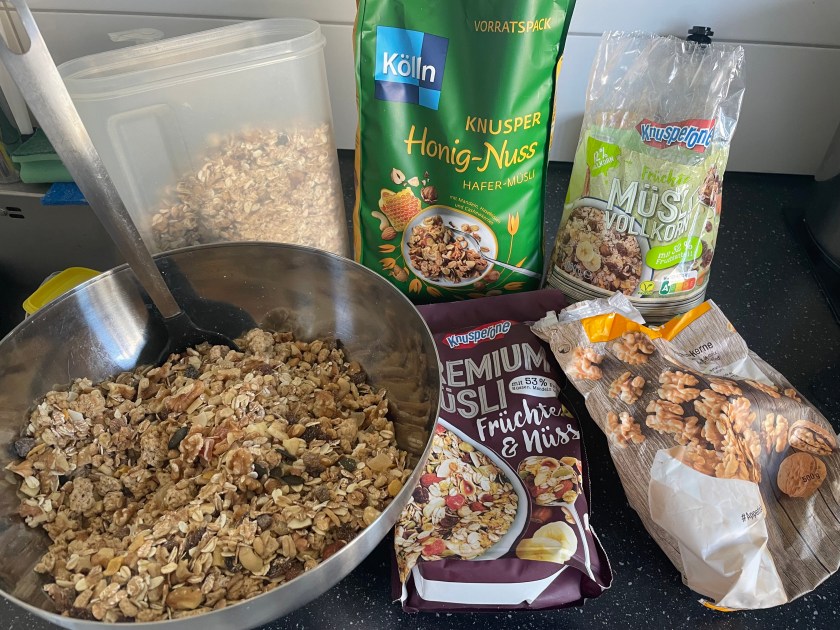 I also prepared a batch of my kind of breakfast cereal. These are the different kinds of muesli I mix together for just the right blend: