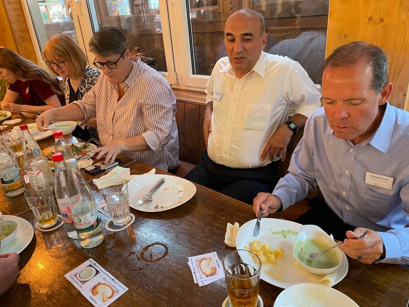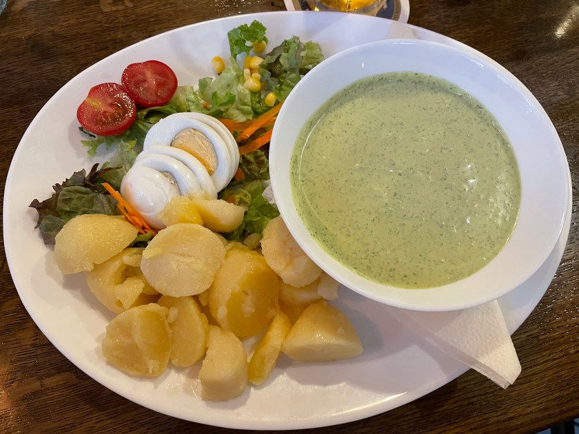 We had 2 choices for dinner. One was a very delicious and famous Frankfurt dish: Frankfurt Green Sauce is served cold over hard-boiled eggs and boiled potatoes. It is made of seven different kinds of herbs: borage, chervil, cress, parsley, salad burnet, sorrel and chives.