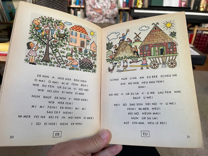 During our lesson she showed us her family scrapbooks and photos of sending her son off to first grade. She also brought out this beautiful 1945 reader from her own childhood. It had the most exquisite little illustrations.