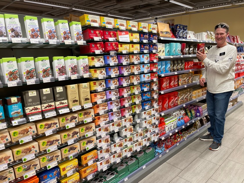 We planned an outing and our first stop was the big Migros grocery store to find some Läckerlei. Of course, John went straight to the Swiss chocolate aisle to look for his favorites. We were both happy!