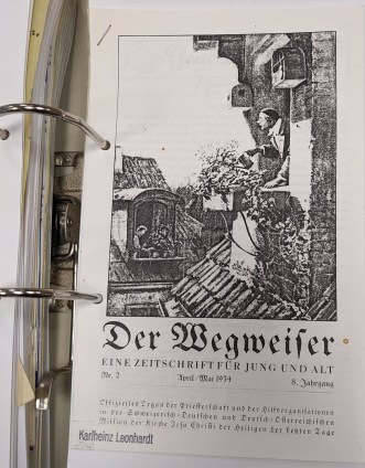 This issue of “Der Wegweiser,” collected by Elder and Sister Irving as part of their Church History mission was dated April/May 1934. Already in its 8th year of publication, it must have begun in 1926. A translation of the title page is: