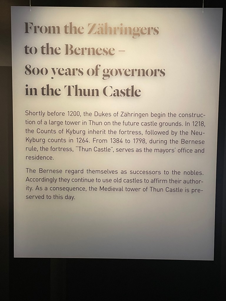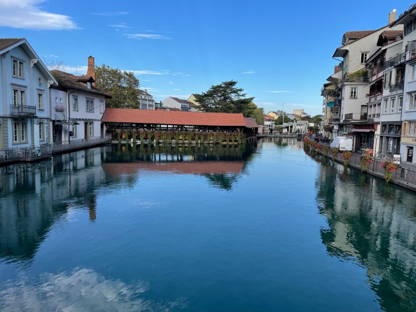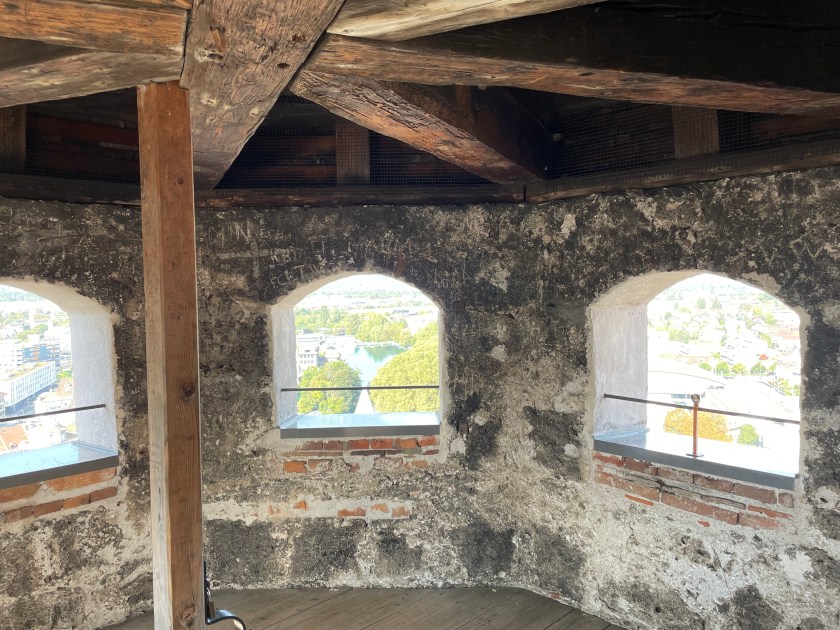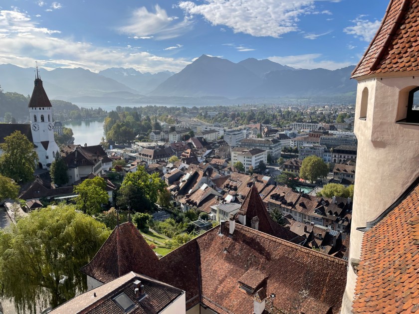 We had a walking map of the sights here and spent the morning walking and enjoying them–along the water, the covered wooden walking bridges, the old beautiful buildings. These towns were never destroyed like most of Germany. The window boxes with hanging geraniums are spectacular in pinks and reds. We worked our way up the hill to the Thun castle up on a hill overlooking the city. It was spectacular. Most are. I know I say that a lot. It’s just such a wonder to us to see so many old and beautiful things around us.