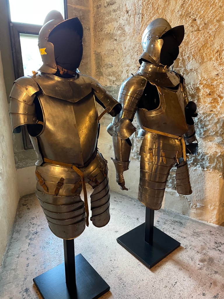 The tower rooms were once used as prison cells and torture rooms. One display showed the torture tools once used here, but you could only look at them through a board with 1″ holes in it, to discourage people from taking photos of the implements. Interesting. There were displays of swords and executioner’s weapons.