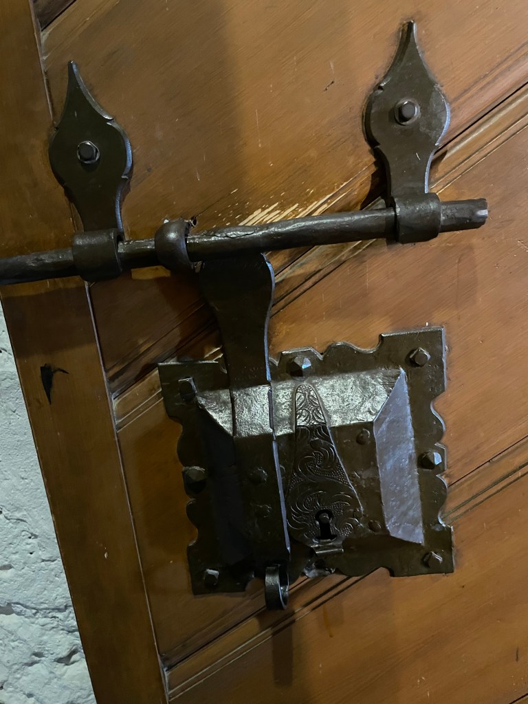 We climbed to the top where we could see the “hip roof” all constructed from wood before nails were used, built in 1434. The original 1200s roof had been replaced. The wood beams were all original to 1434. The views from the 4 towers were spectacular! The roof is made out of clay tiles. I love looking at the details like the door knobs and locks. So intricate and interesting.