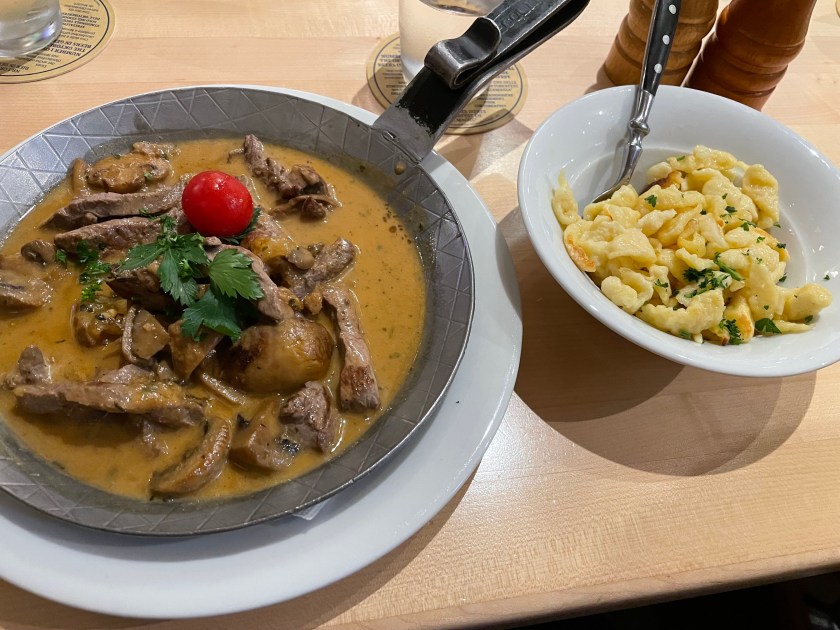 Oh my, this food was so good!! Schnitzel, Spaetzle and creme sauce. YUM.