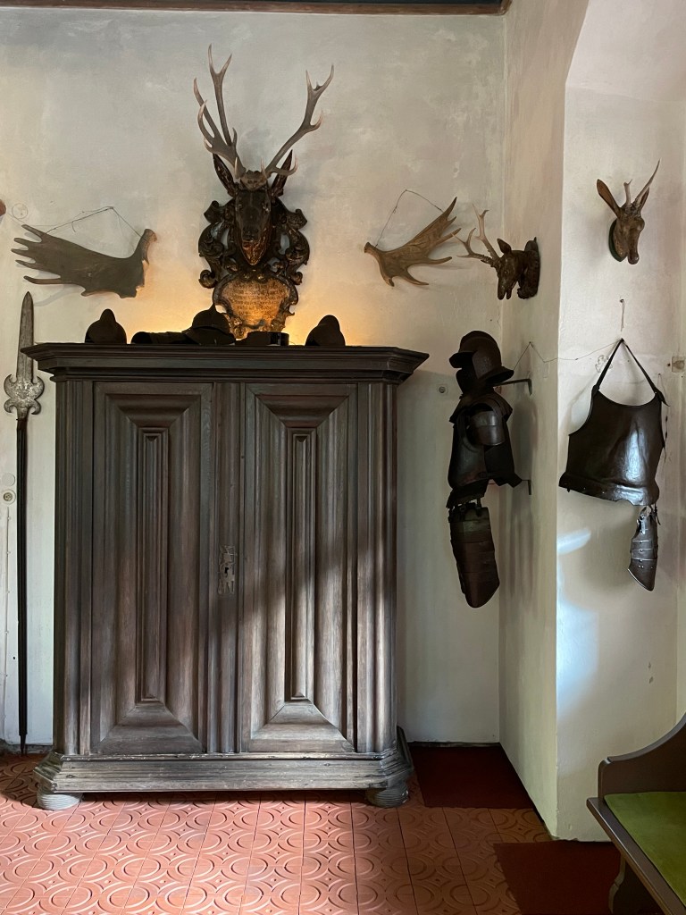 We were allowed in about a third of the castle proper. The main room and dining area felt like hunting lodges with lots of weapons and antlers on the walls. There were paintings of hunting and wild boars and hunting dogs. There were spears for killing wild animals. There was a really old bear skin rug under a table. The rooms weren’t massive, rather comfortable sizes. We saw the places listed above. There were flowers in the rooms and original furnishings that were 200-300 years old. I like it when you get a feel for HOW the people lived in places like this.