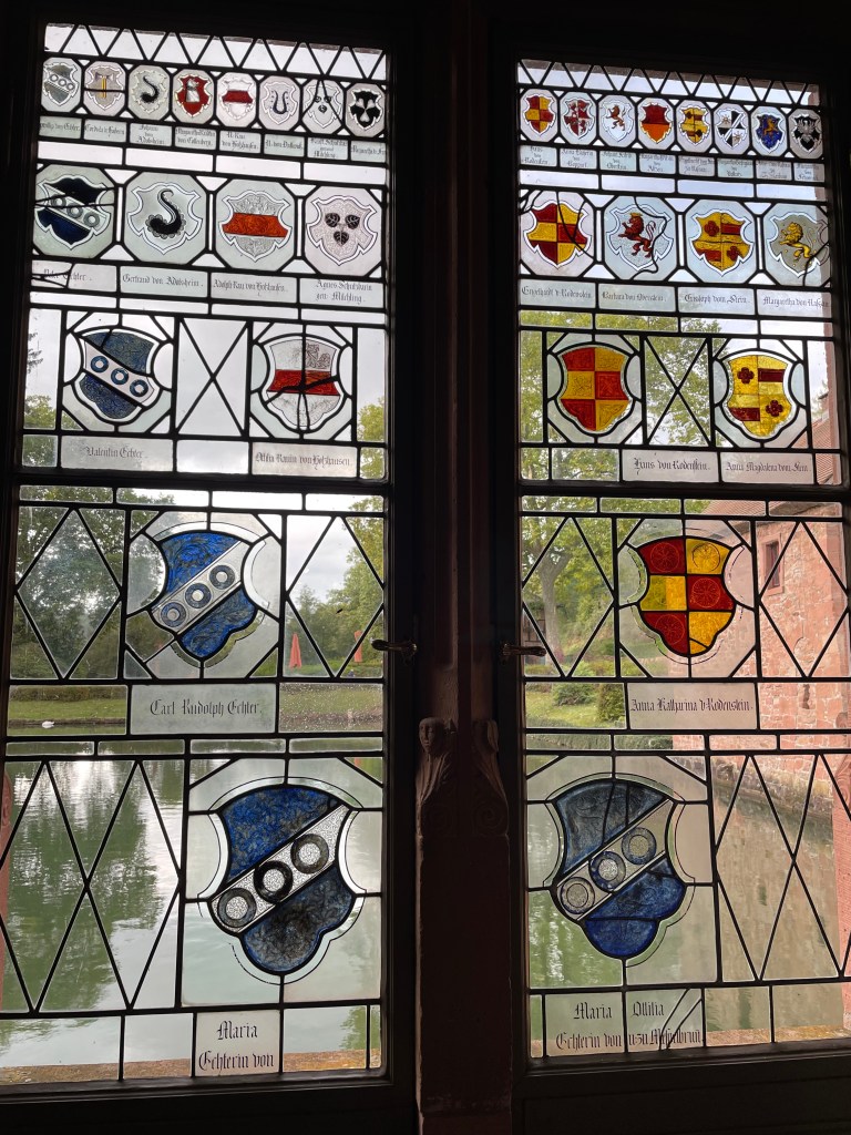 I really loved this place. It was cozy, unlike most other castles we’ve visited. It was nice to know that family still lives in the private wings. We learned about the family–one of the wives had 22 children here (14 survived). I think she was the wife of one of the oldest ancestors who lived here. There were so many family portraits hanging we got a good feel for the family history. One of the rooms had a coat of arms pedigree chart in a stained glass window.