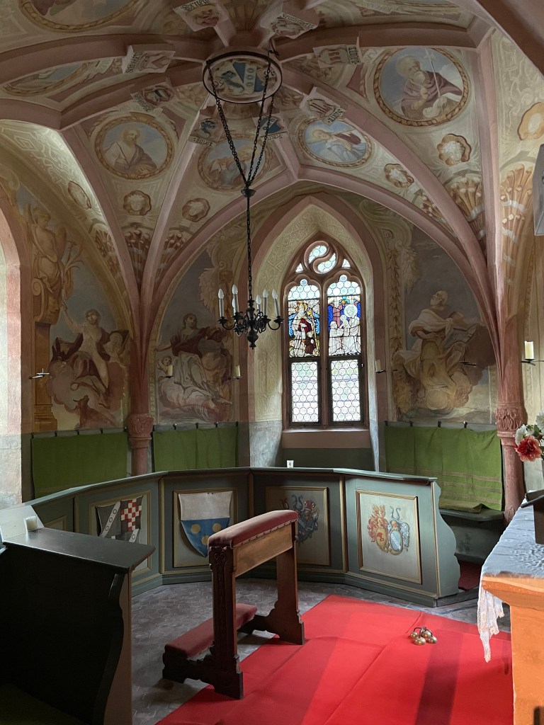 One of the main highlights of Mespelbrunn Castle is its beautiful interior. The castle’s interior is open to the public on tours only. It is smaller compared to other castles in Germany, but unique and interesting to see. There are several rooms you can visit as part of the Mespelbrunn Castle tour. Many rooms have furniture and artifacts from the family. [No photos allowed inside most rooms of the castle.]