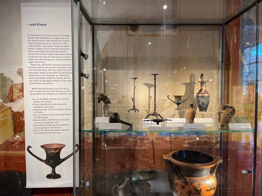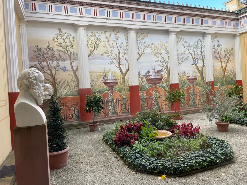 Next we went to see the Pompeiian. It was walking distance along the river, also built up on the hill overlooking the water. This villa was built by King Ludwig I of Bavaria because he loved the Roman villas in Pompeii. He wanted one built to copy one there. He never really lived in it. It was like a big play house for him because he fancied it.