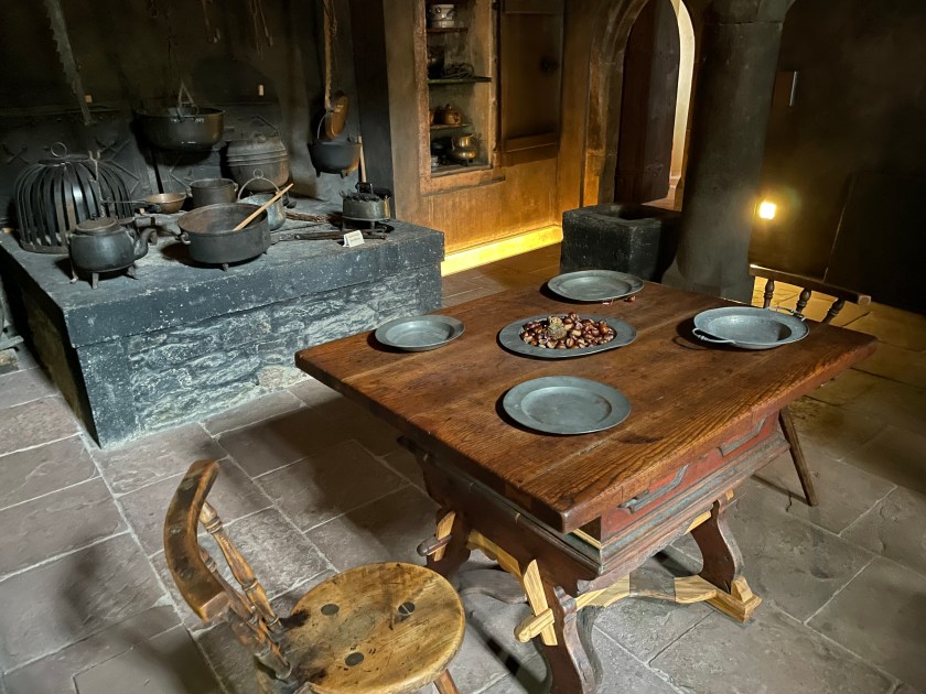 Here is a Medieval kitchen with a large hearth and fire and a well inside the room. Fascinating. Imagine being a servant working here.