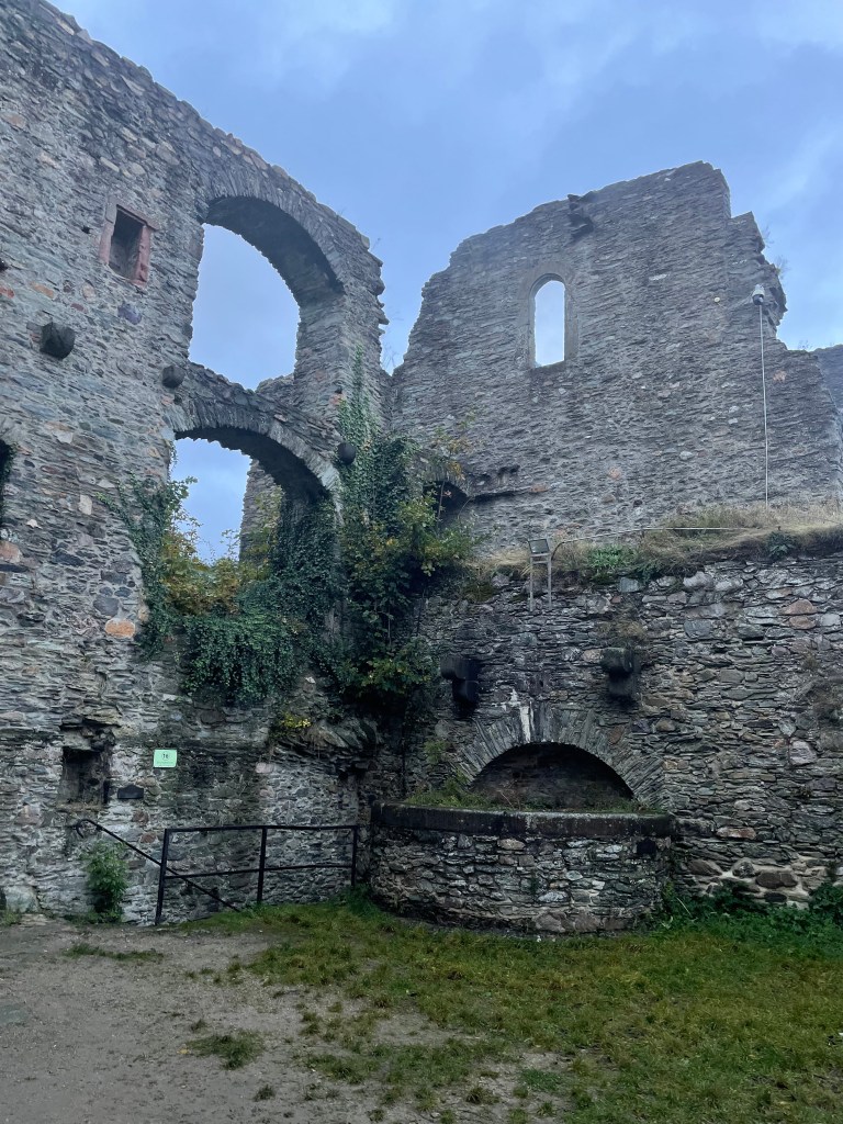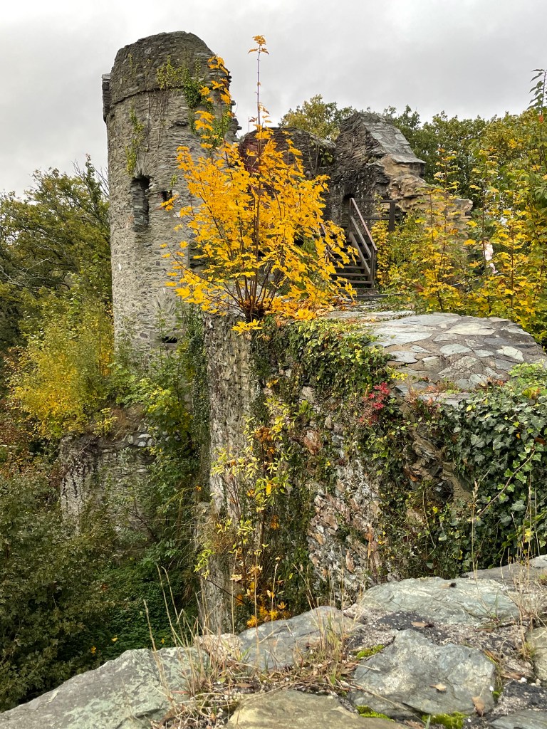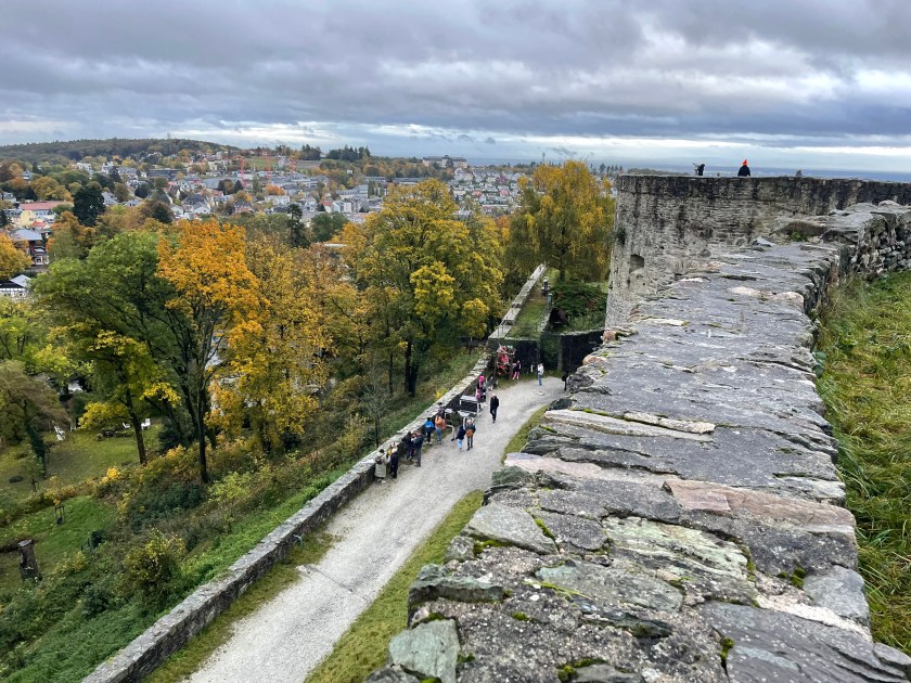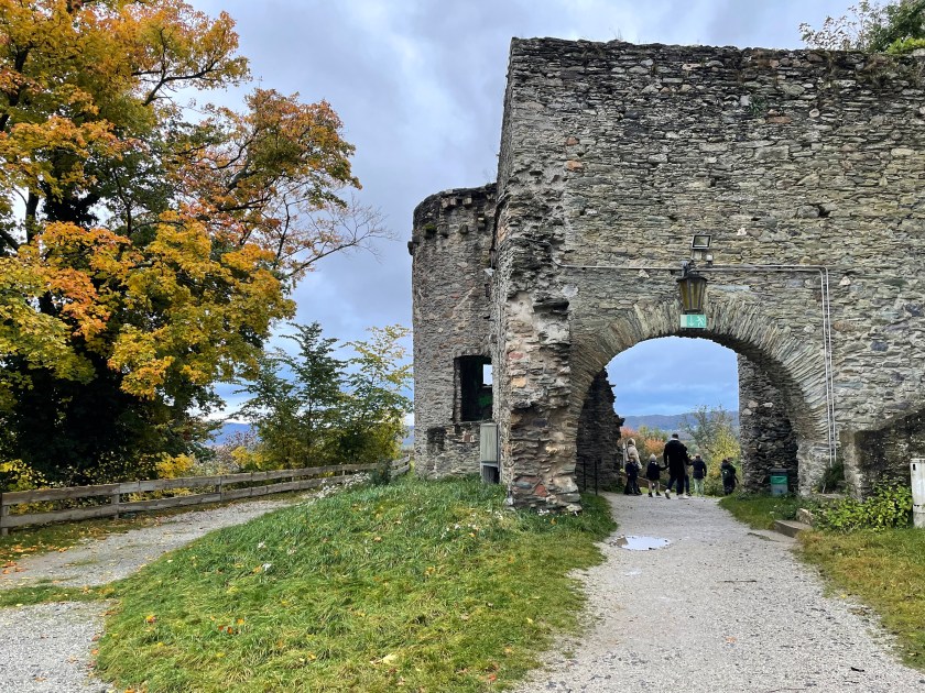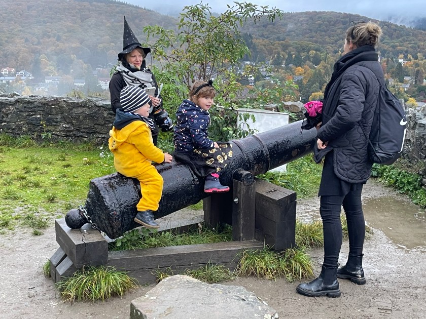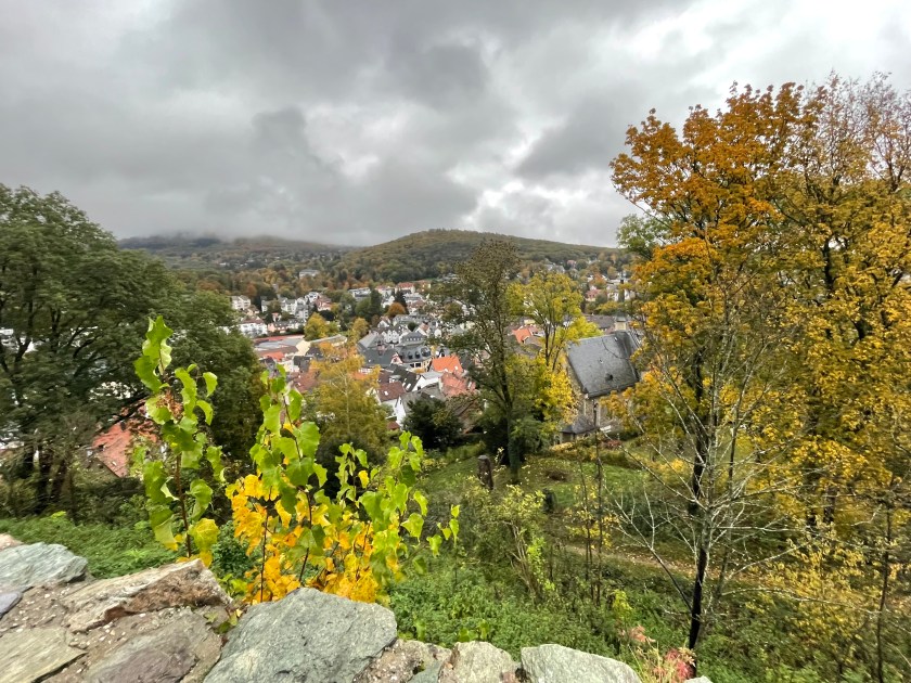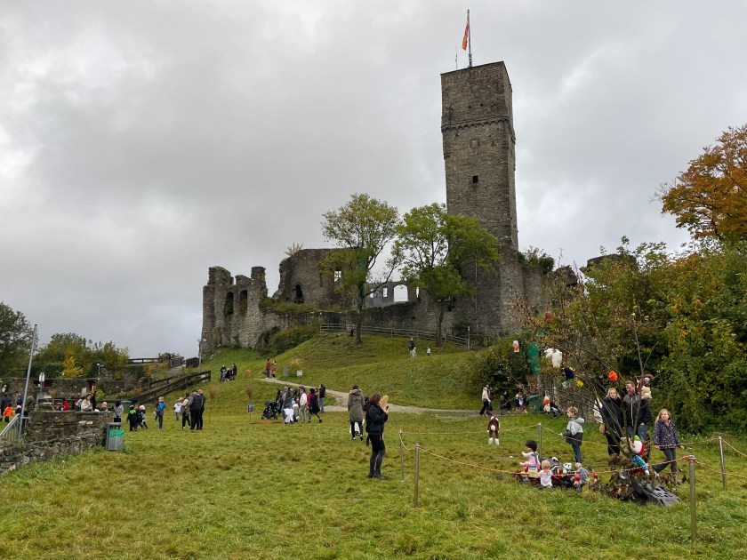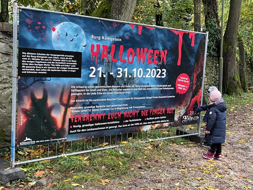 After visiting the the Falkenstein Berg ruins, we drove about 10 minutes to the last of our 3 destinations today: the Schloss Konigstein ruins. As we parked we noticed lots of families with kids dressed in Halloween costumes in the streets all going somewhere. There were ghosts and spooks and skeletons and little masked boys with scary faces. Moms had witch hats on and some had painted faces. It looked like they were all going to a party. We wanted to follow them, but soon realized they were going up the hill to the same place we were going.
