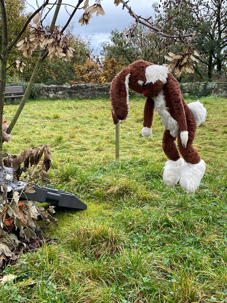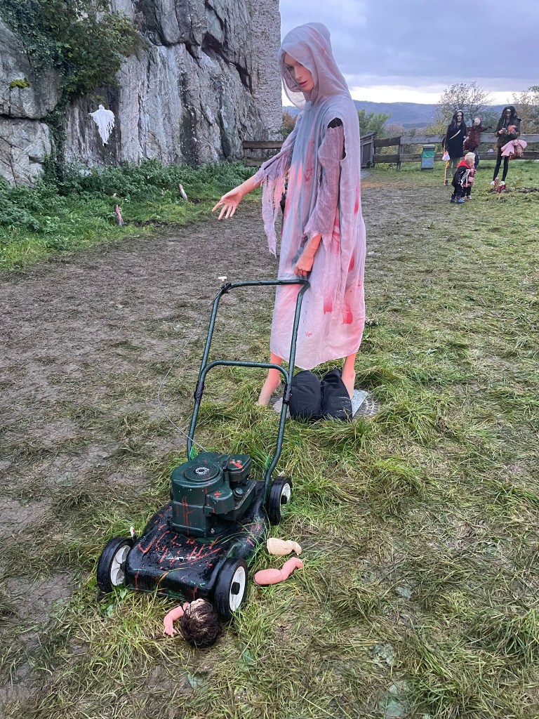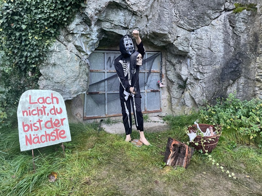 The decor included a Friedhof (cemetery) with some gruesome decor–one was a manikin of a woman in a blood-smeared dress pushing a lawnmower. Look what was under the lawnmower: