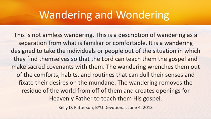 This reminds me of why we spend so much energy giving our youth experiences like girls camp or trek. Someone once said, “it’s not an adventure unless you wish you were home.” I suppose the same can be said of Wandering Times in our lives. We would rather be comfortably Home.