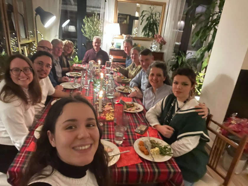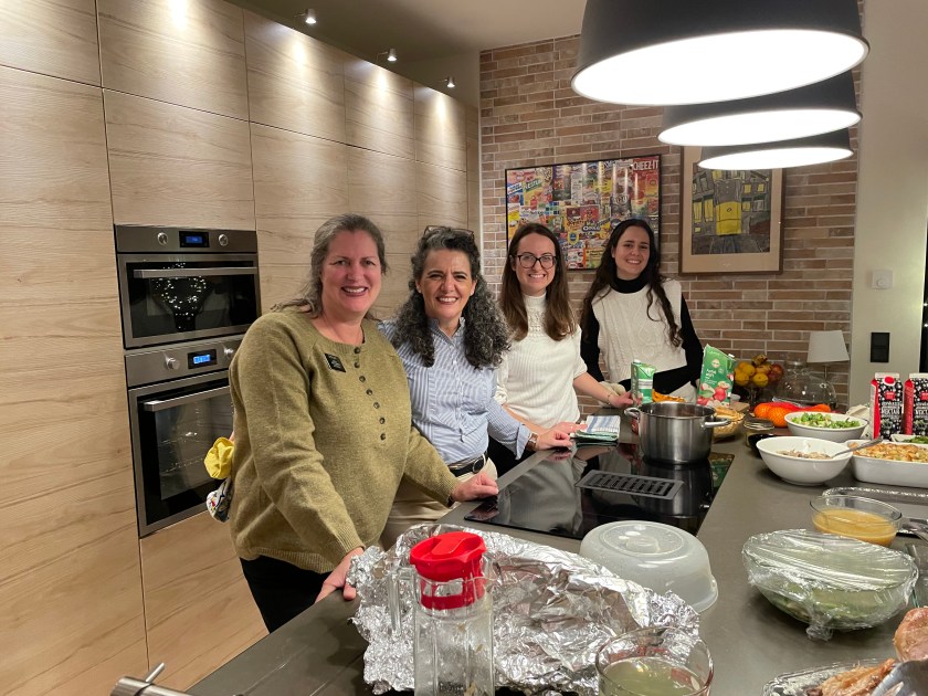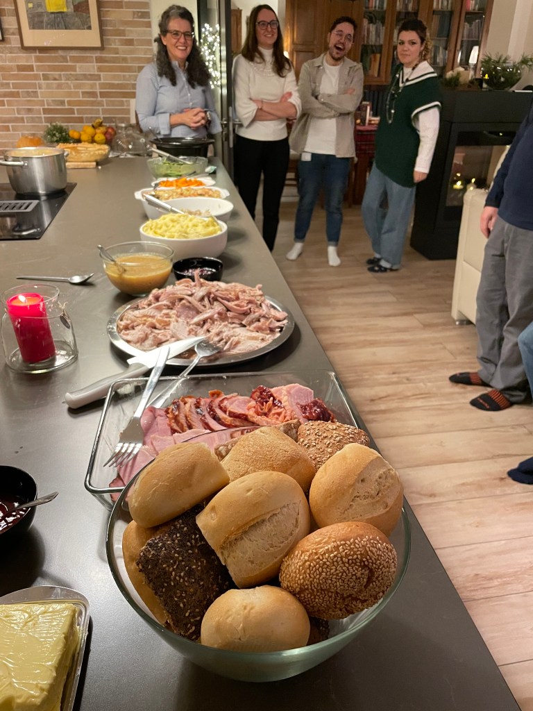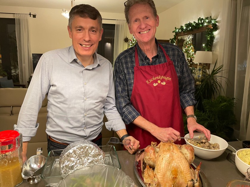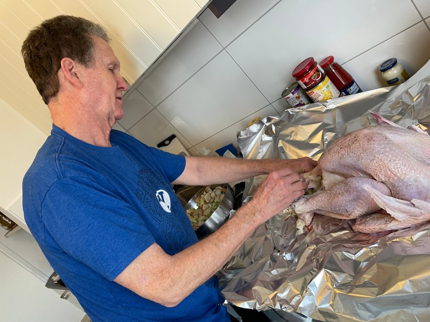 A fun tradition in John’s family we call, “The Flight of the Turkey.” Every year, the turkey flies across the kitchen, squawking, even here in Frankfurt! John is our turkey and stuffing Meister, I’m not really allowed to help. He has his ways. I stay out of his way.