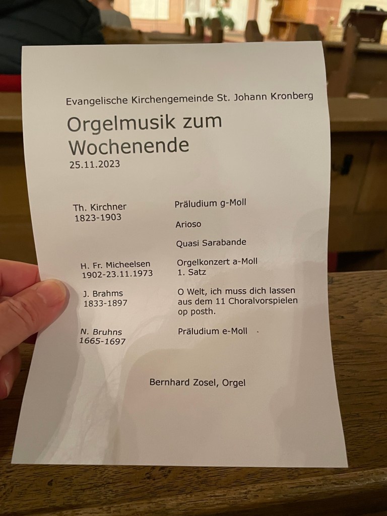 Kronberg Organ Concert 2023-11-25 Eppstein (1) 2023-11-25 Eppstein (2) As we left the beautiful chapel, the bells in the tower began to chime. It was glorious. Share this: Click to share on X (Opens in new window) X Click to share on Facebook (Opens in new window) Facebook Like Loading... Related Author: Ann Laemmlen Lewis Thank you for visiting! I hope you enjoy the things shared here. View all posts by Ann Laemmlen Lewis