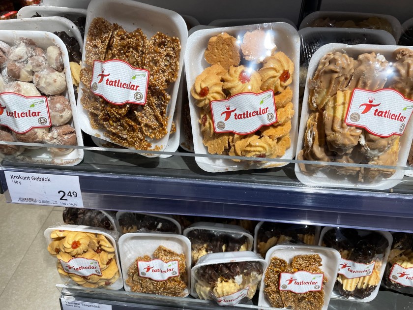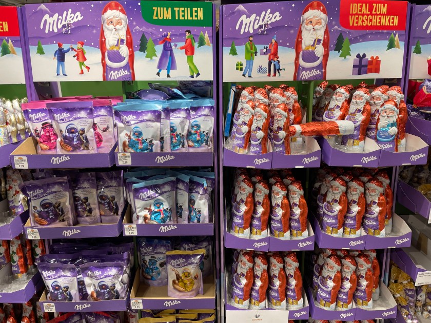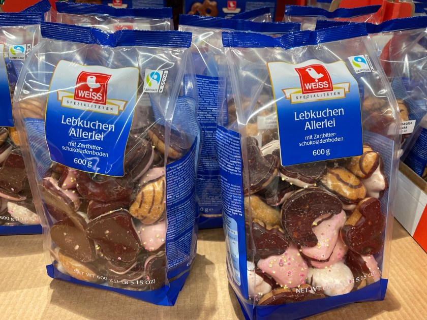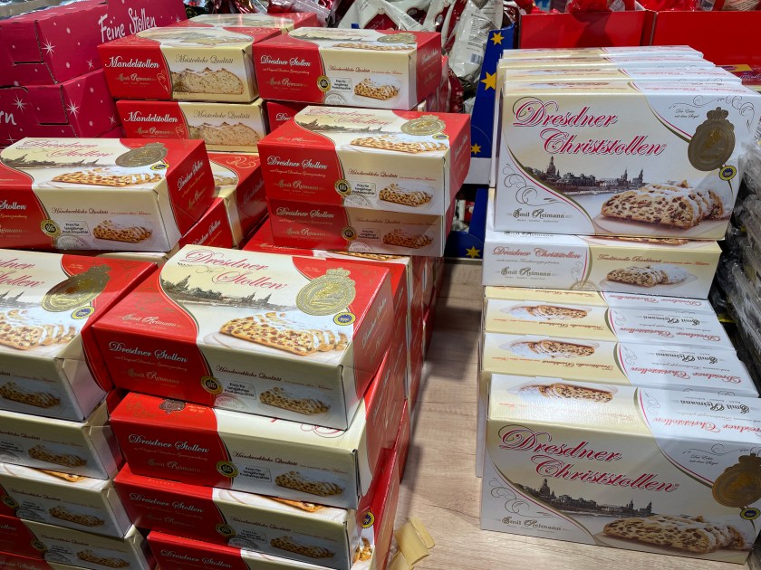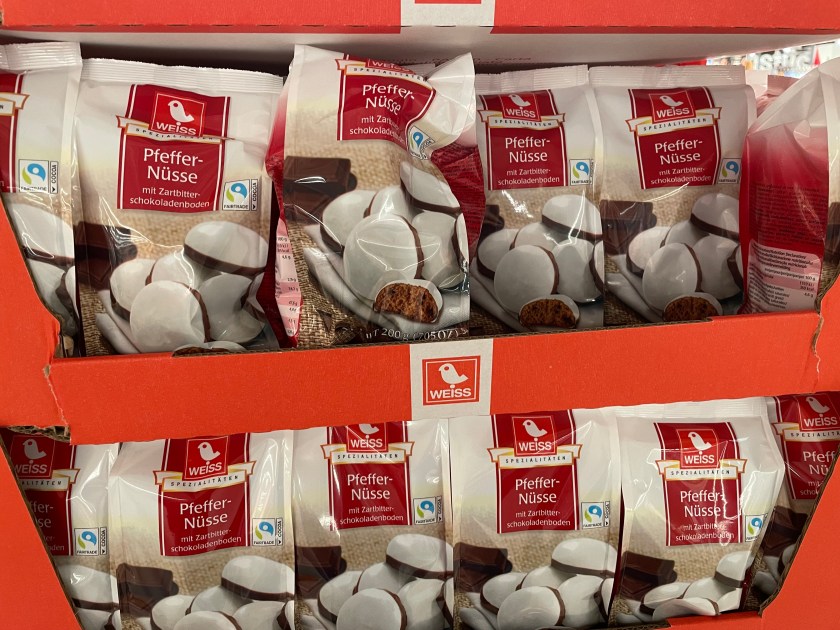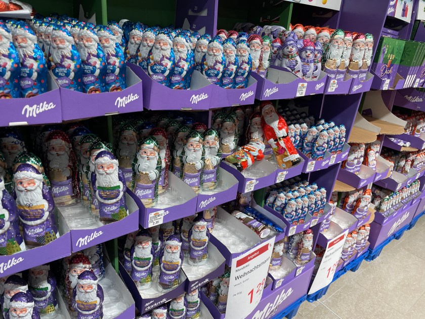 It’s a colorful time here in Germany. My favorite treat remains STOLEN (a Christmas bread with raisins, nuts and candied fruits). I’m just not a chocolate lover or candy eater, but it’s all fun to look at. This is what I’ll pick every single time: