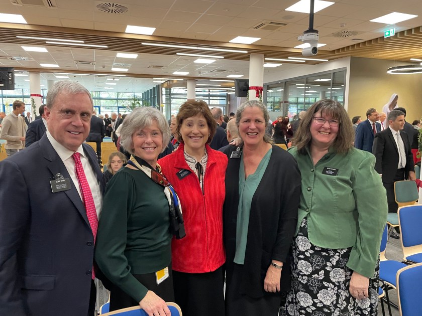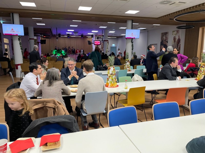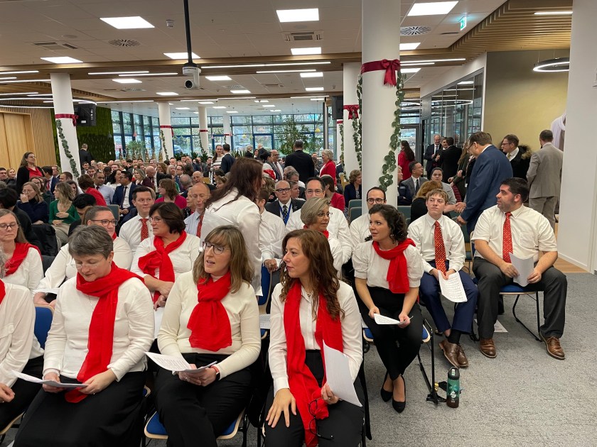 Today was our “Workforce Christmas Devotional.” At 11:00 everyone in the building gathered in the newly-finished multipurpose room downstairs for this special meeting with our Area Presidency and their wives–the De Faos, the Alliouds and the Gerards.