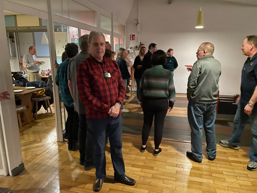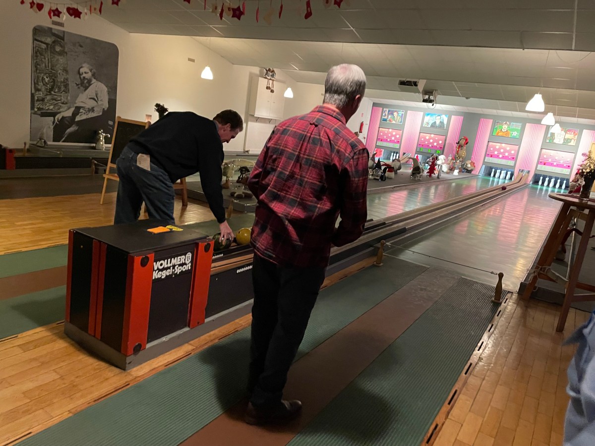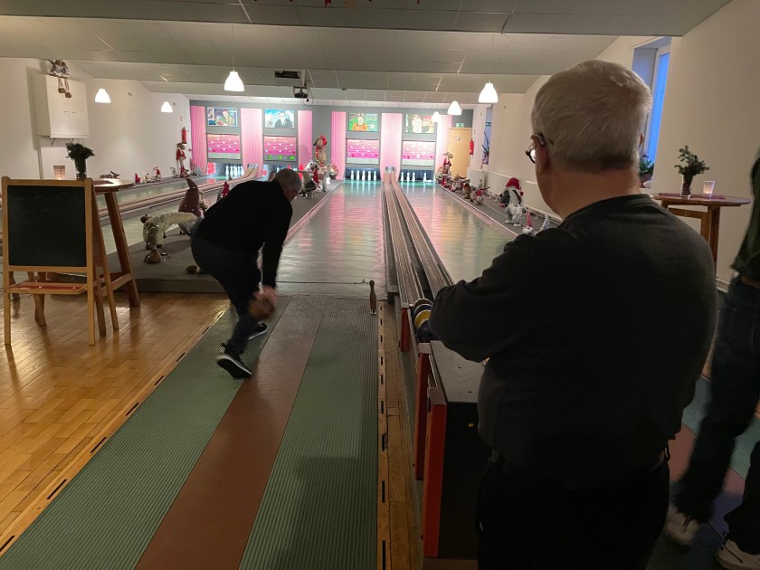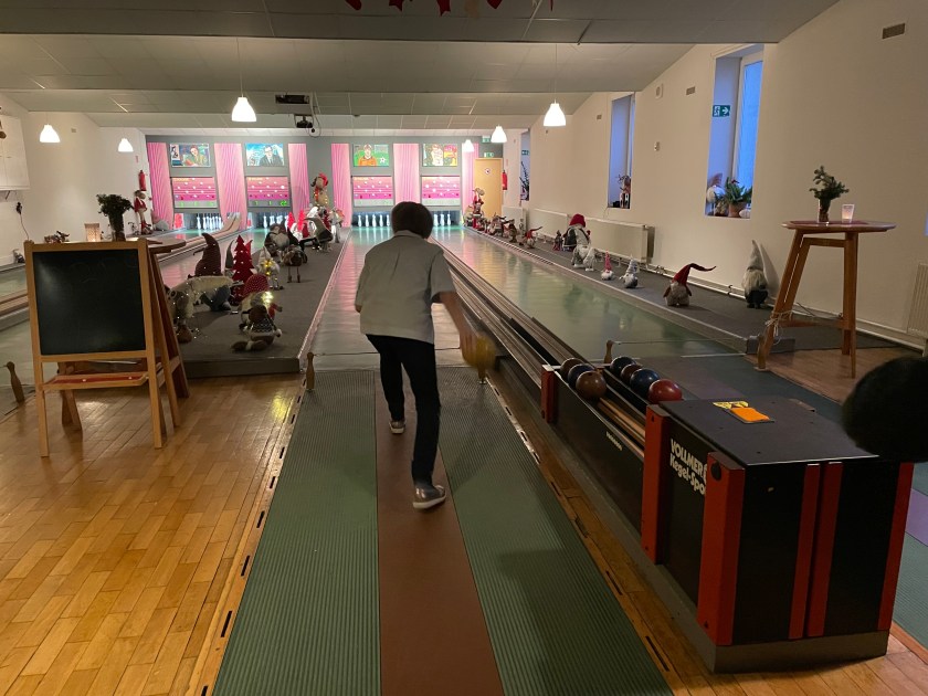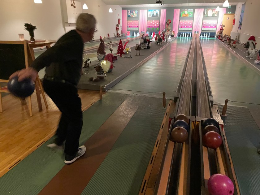 We had a fun zone activity this evening–German bowling. It was quite fun. We had the place reserved, with all 4 lanes. The bowling balls are small with 2 finger holes. The 9 pins are tied to strings. Everyone takes turns. You throw the ball once for your turn and count the number of pins you knock down. You add the number of pins down after each turn. Then the pins are re-set. The first team to 100 wins. BUT, if your count lands on a double digit number like 11, 22. 33, 44, or etc., you have to go back to zero. That happens more often than you’d think. We had 4 teams competing against each other, with everyone divided between the teams.
