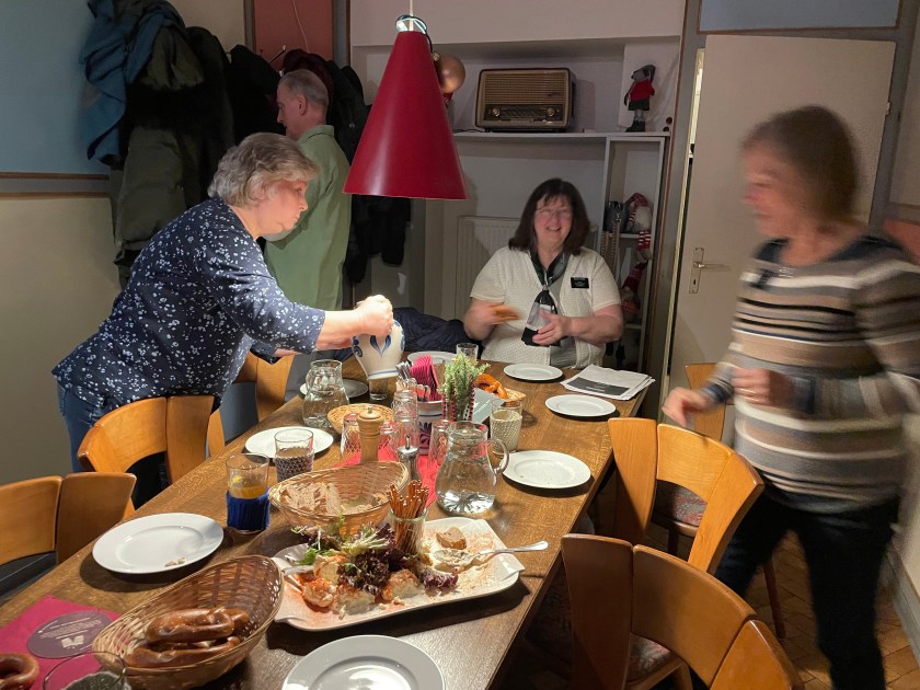 We had good snacks–apple juice and fresh pretzels and some things to dip them in. Lots of laughing and fun.