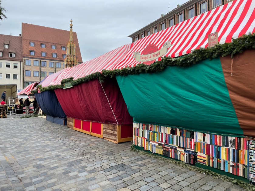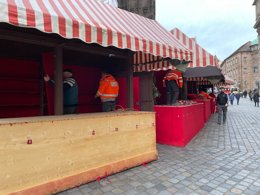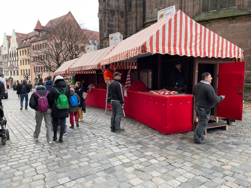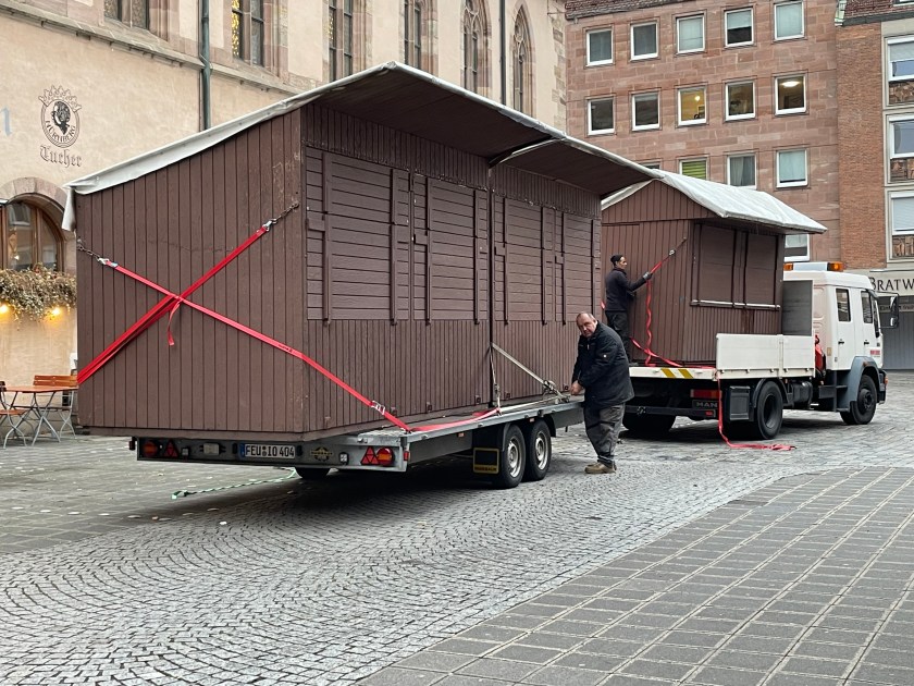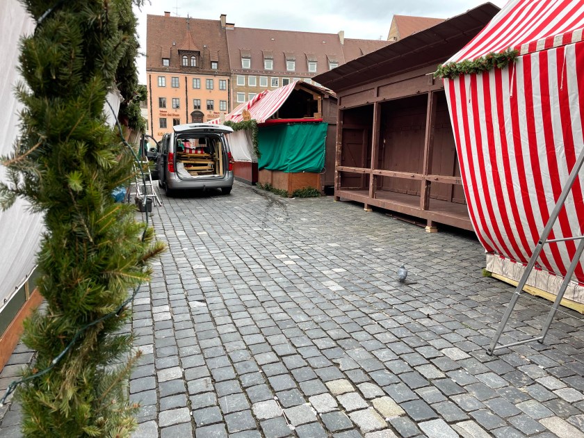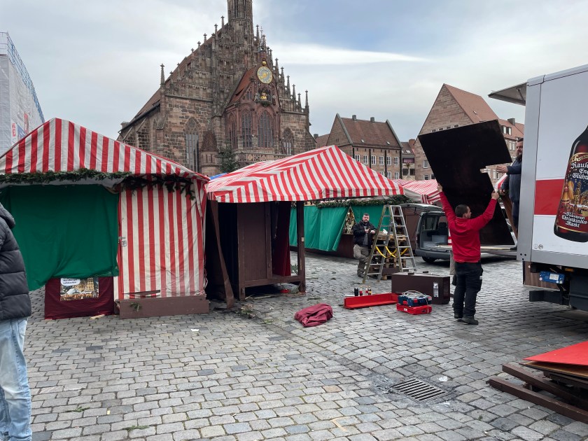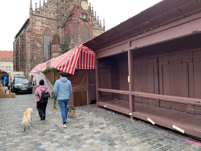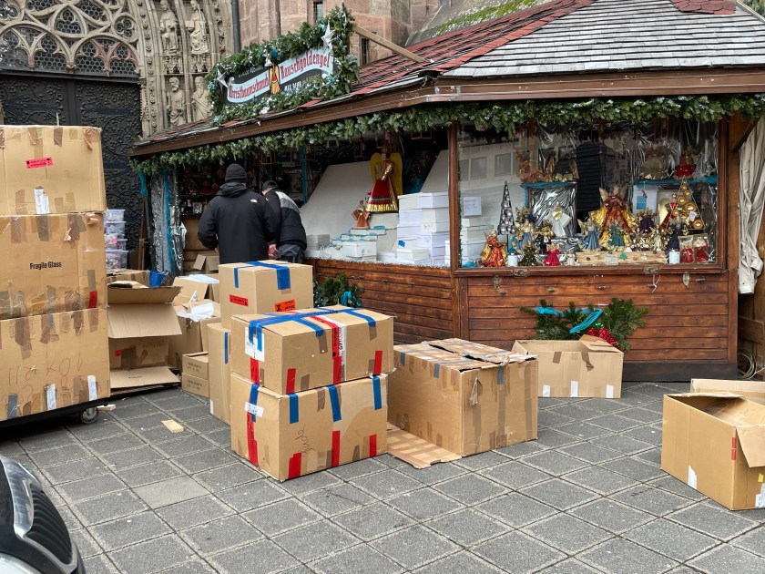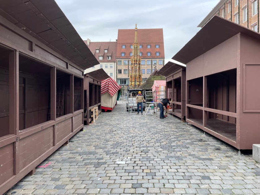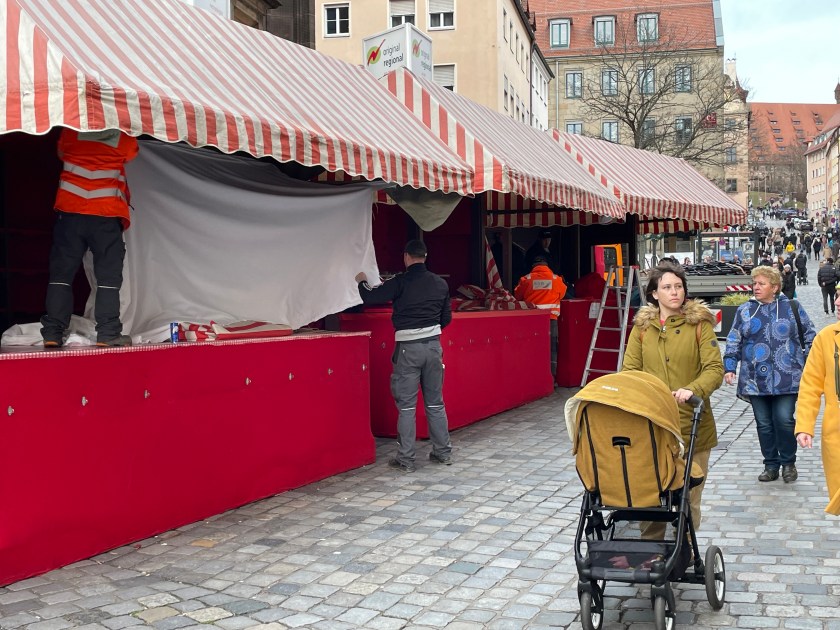 Nuremberg is famous for its Christmas Markets with the red and white striped roofs. There are several market areas here and some are still going, but most are being packed up and taken down this week. It was interesting to watch the crews disassembling the booths and packing things up.