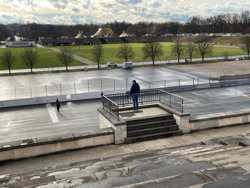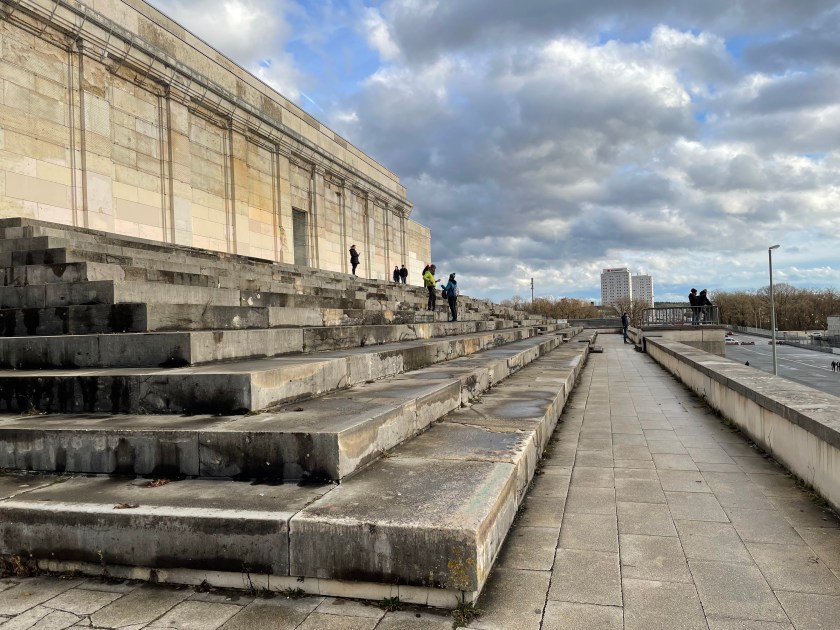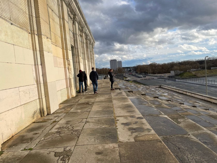 Our walk around the lake and along the Great Street led us to the Zeppelin Field and its main grandstand. These were the only planned structures that were actually completed. It’s larger than 12 soccer fields and had a capacity of up to 200,000 people. This is where mass parades of the German Labor Service, the Wehrmacht, and the “political leaders” (Nazi Party officials) were staged in front of the “Führer.”