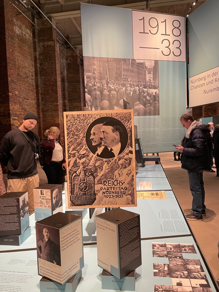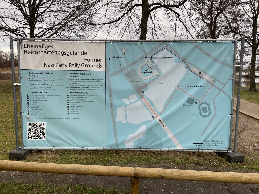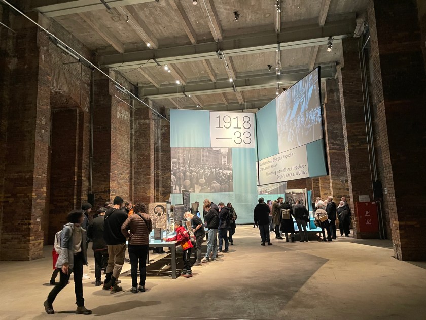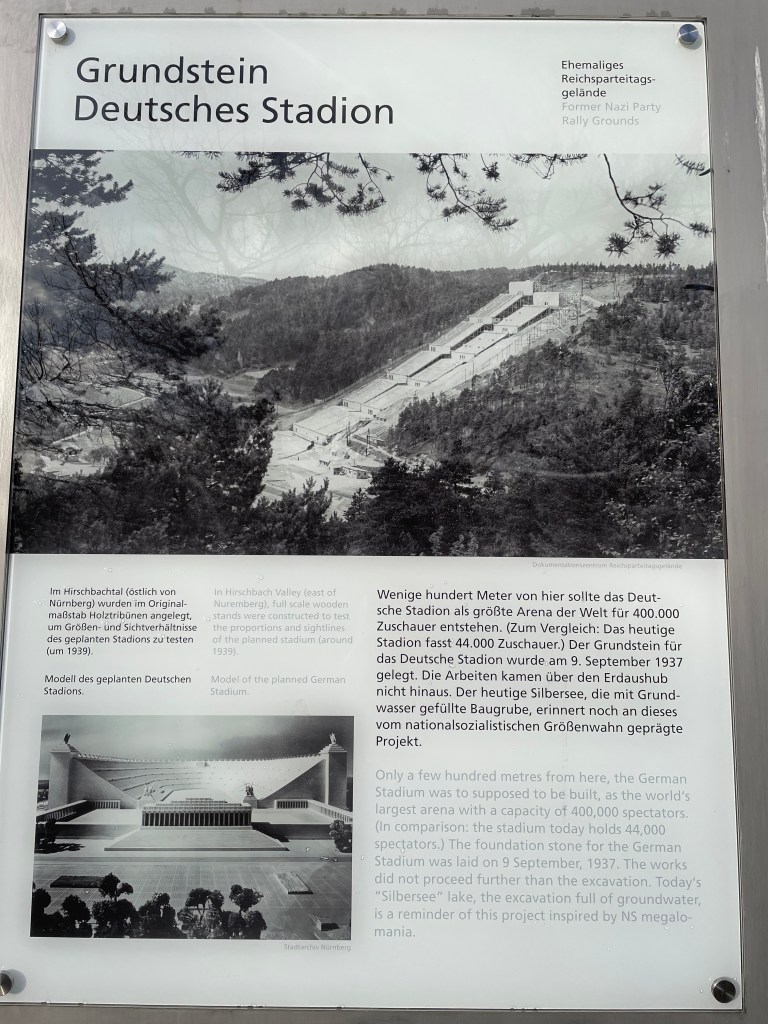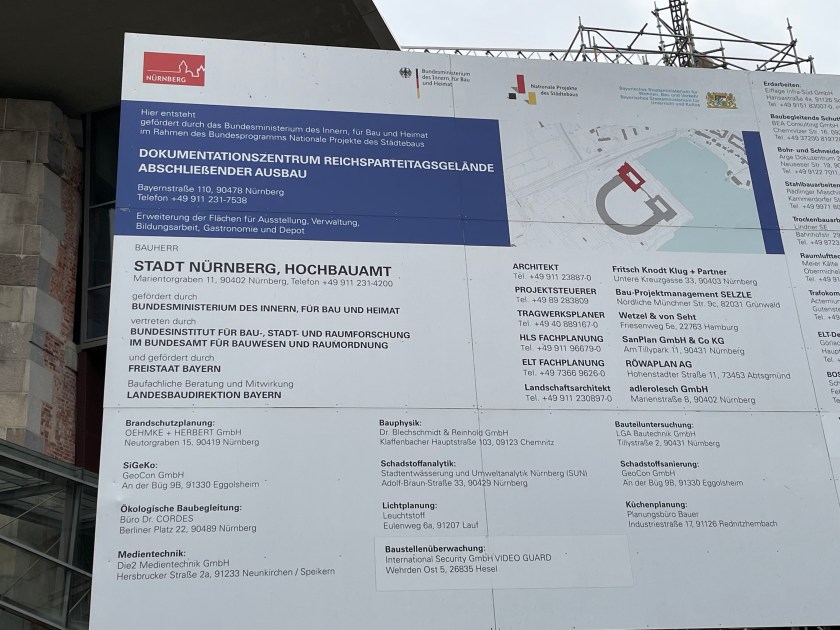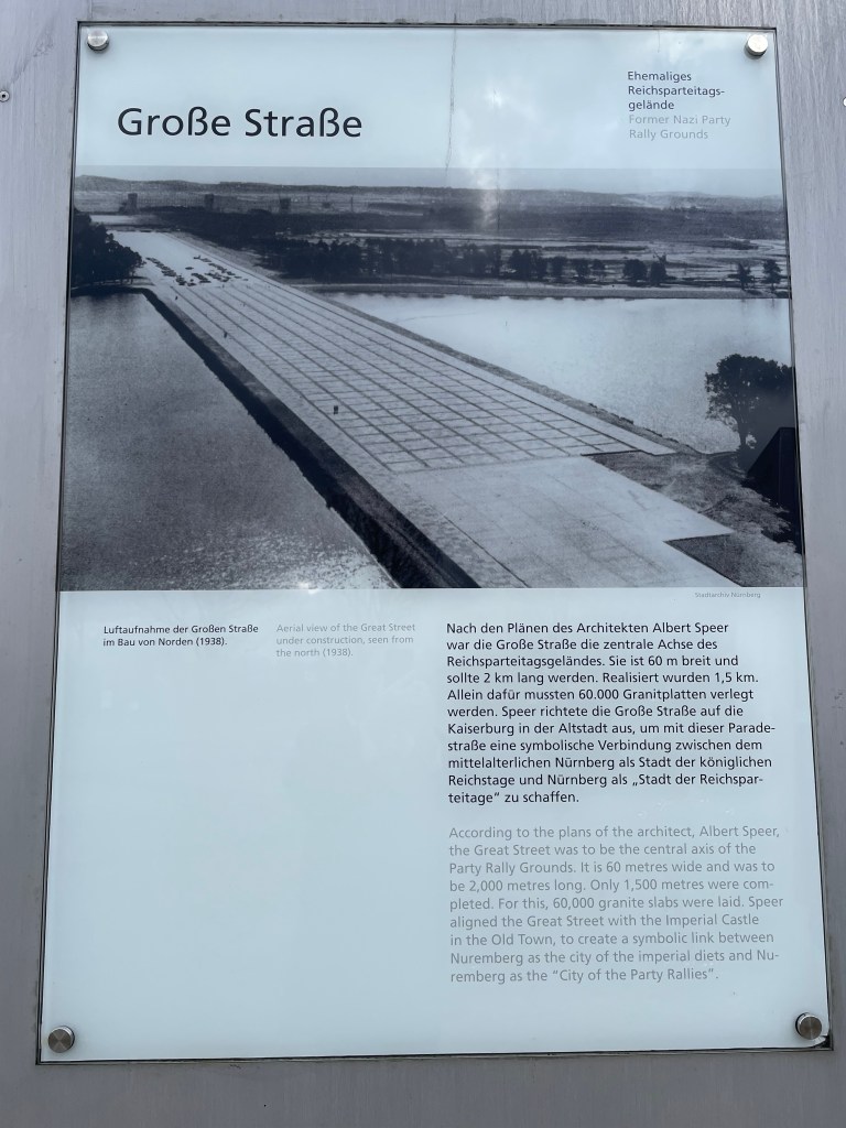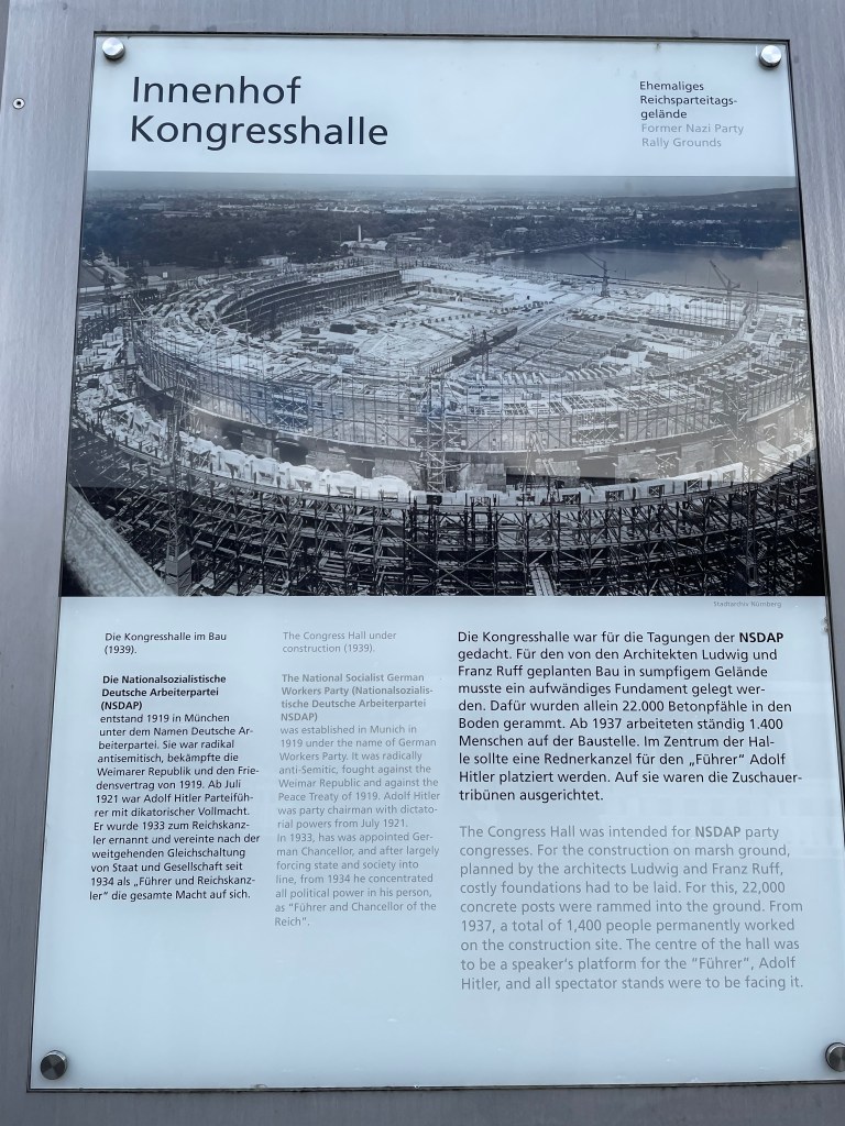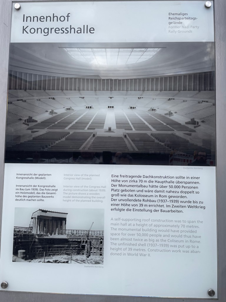 Here is where the bus let us off–outside the colosseum that is still unfinished. There is a Interim Exhibit called “Nuremberg –Site of the Party Rallies, Staging, Experience and Violence” in a large exhibit hall of the Documentation Center. We spent a couple of hours there, reading and learning (on our phones) about the history of the Nazi Party here on on these grounds. A permanent exhibit is scheduled to open in late 2024.