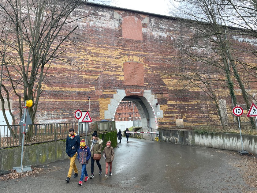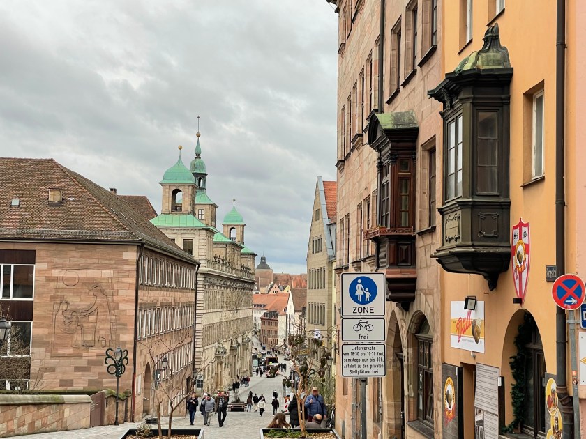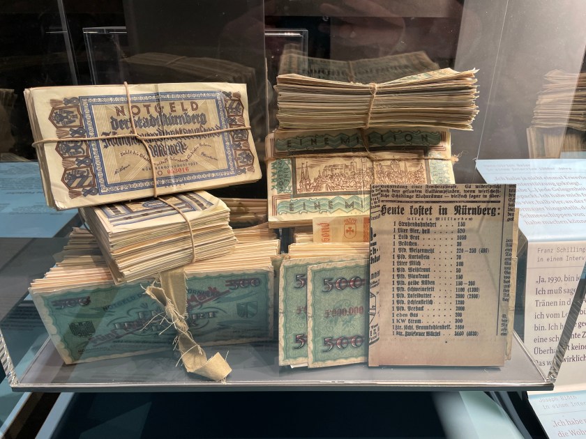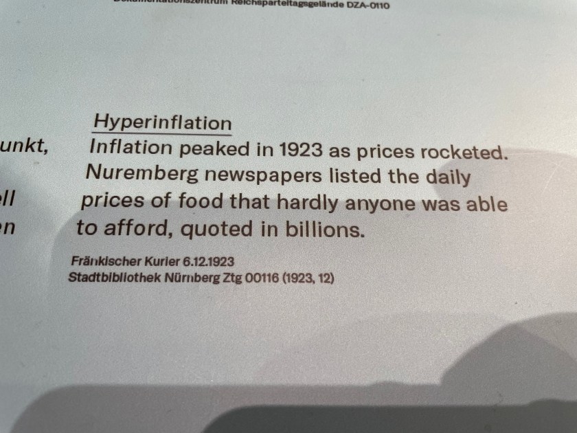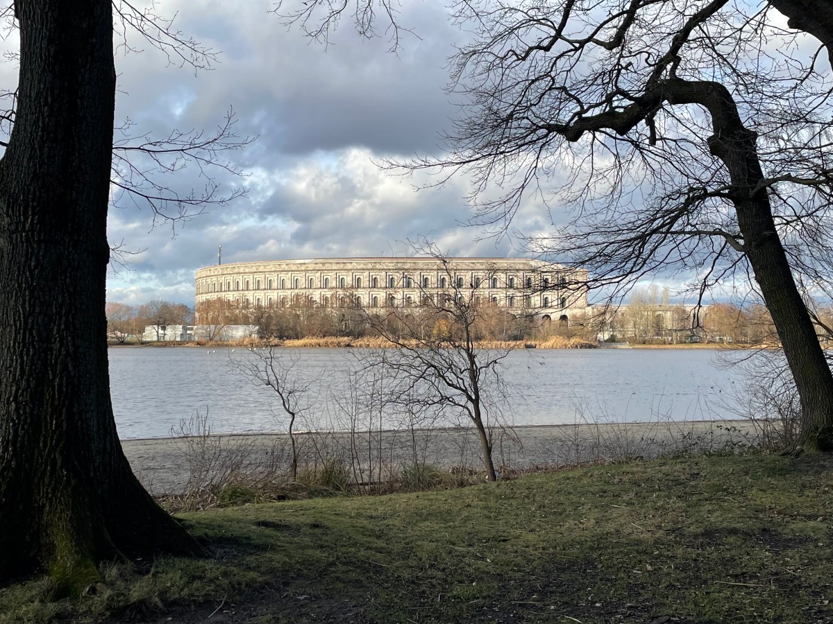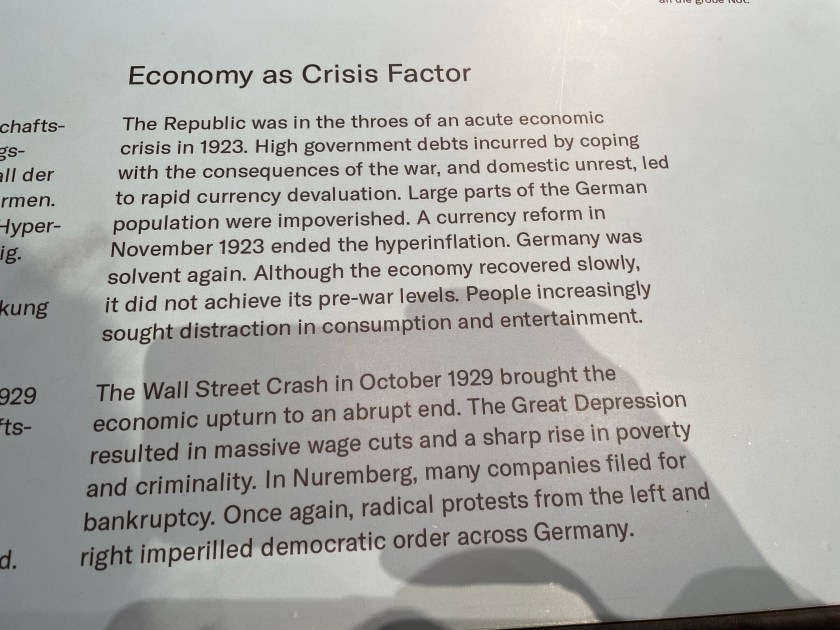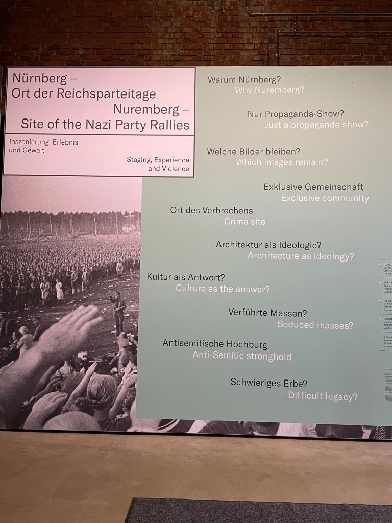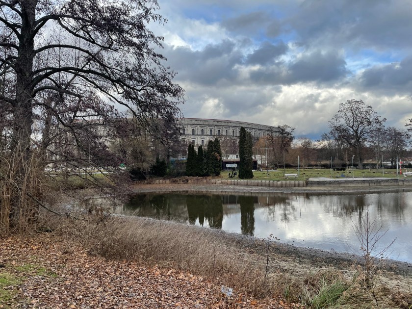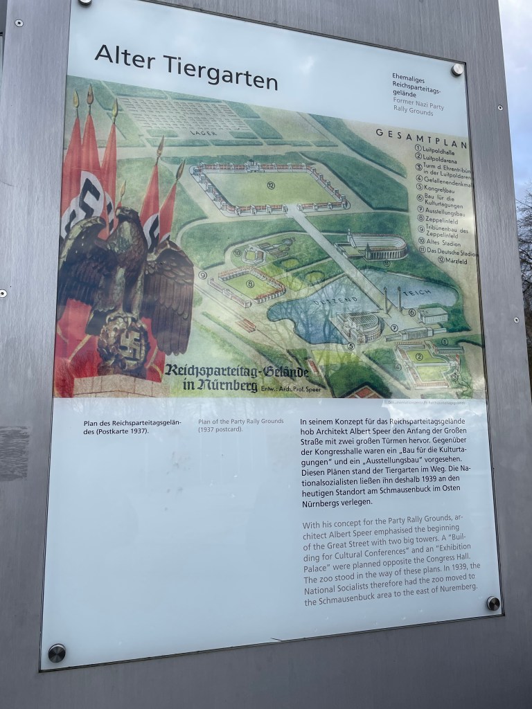 Here is where the bus let us off–outside the colosseum that is still unfinished. There is a Interim Exhibit called “Nuremberg –Site of the Party Rallies, Staging, Experience and Violence” in a large exhibit hall of the Documentation Center. We spent a couple of hours there, reading and learning (on our phones) about the history of the Nazi Party here on on these grounds. A permanent exhibit is scheduled to open in late 2024.
