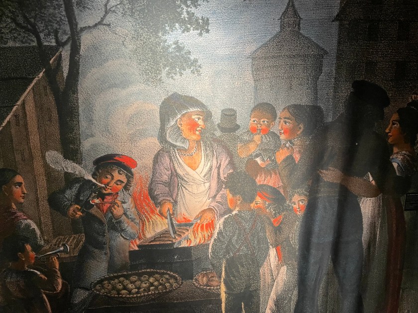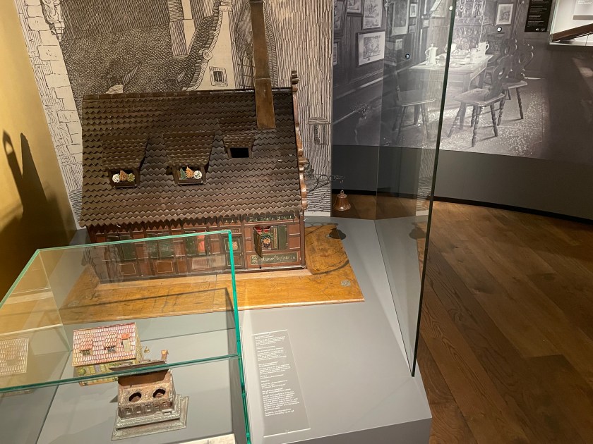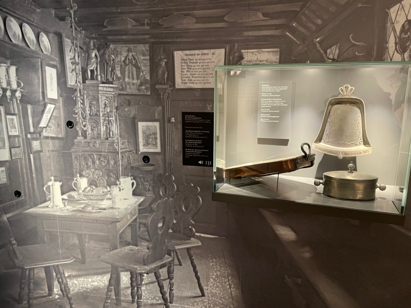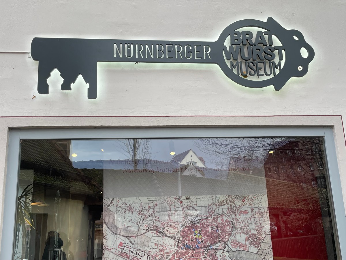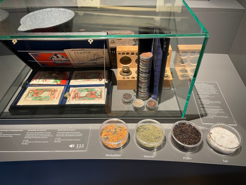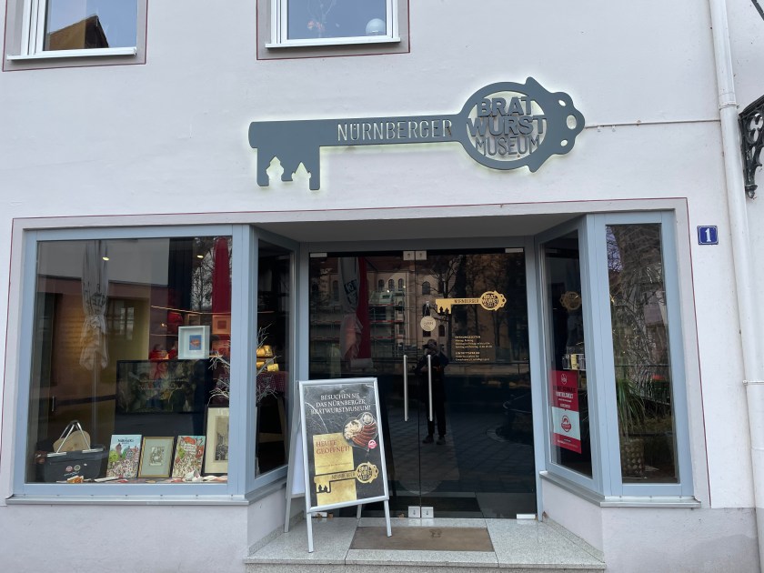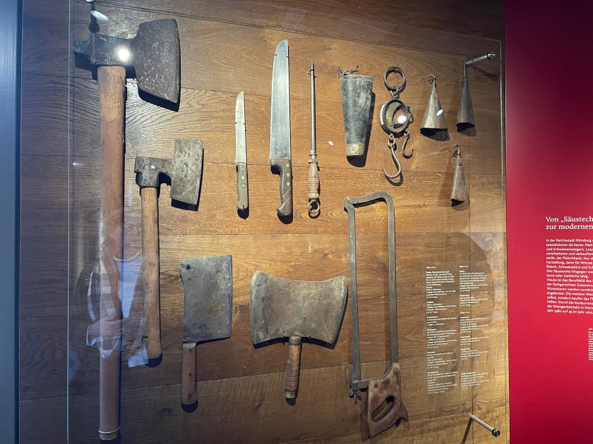 This morning we visited the Nuremberger Brat Museum. It was an interesting, small 3 room place with all the talking on handsets set to English. There were things to look at–the history of Nurnberger Bratwurst, going way back to the 1300s, old pubs and grills, info about the butchers and recipes, a display of butcher tools, and a bit about Brats today.