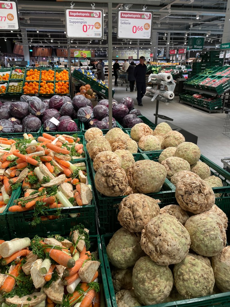 Here is what we’re seeing in our grocery stores this week–bundles of vegetables for a hearty pot of soup. We don’t see celery root at home. I’m going to try it. We asked one lady who had 3 of this in her basket how she prepares celery root. She laughed and said, “oh, these are to feed our Kanninchen!” (rabbits). Haha. But she said you can chop the root and boil it in a vegetable soup or a cream soup. You can also peel it and slice it and fry it like Schnitzel. Hmmm. Sounds good.