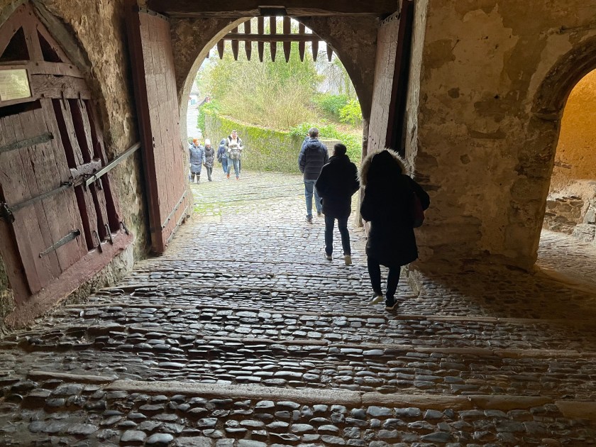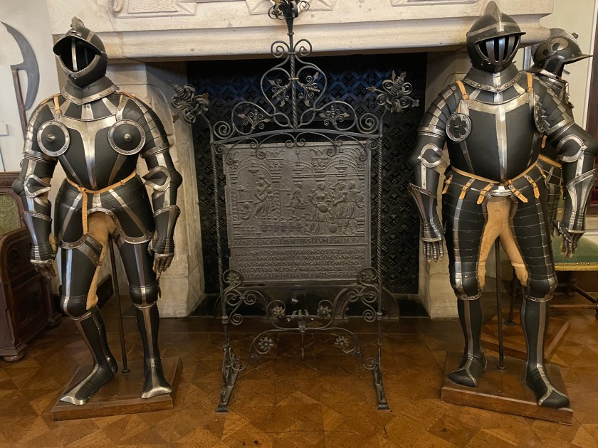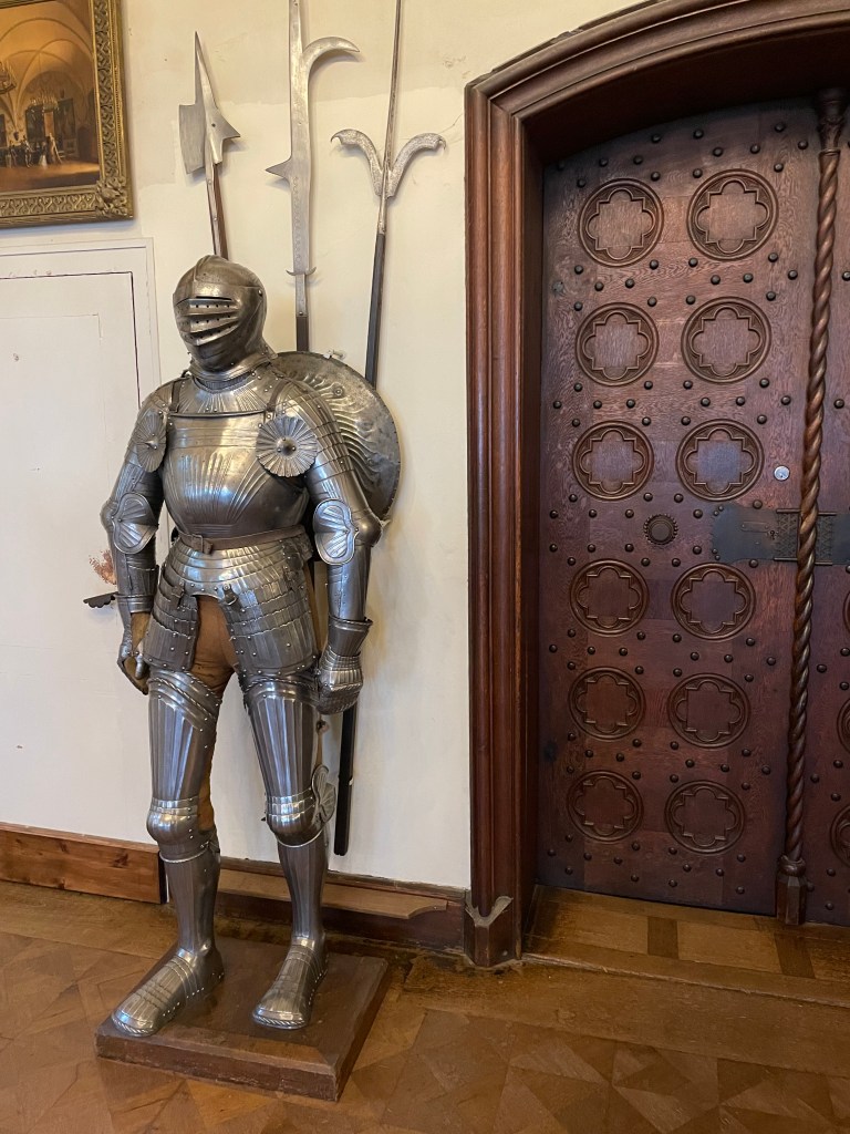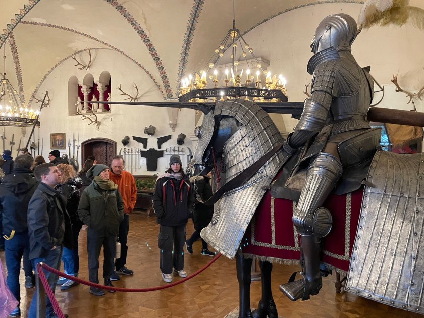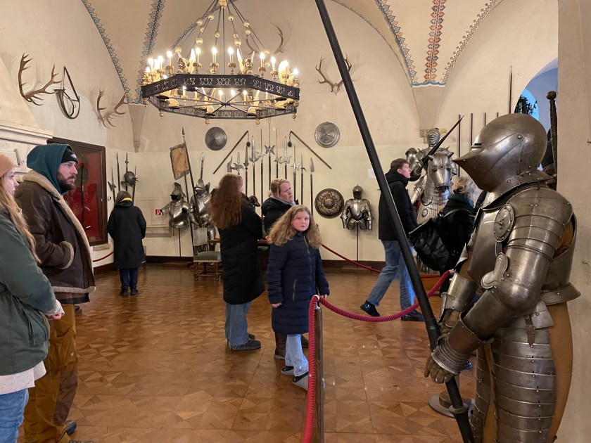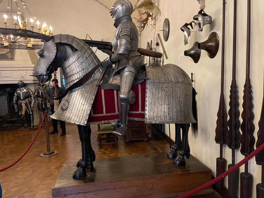 In more recent centuries, they’ve made it look more romantic, more like a princess castle. I think to attract visitors to help keep it going. They have events there now and musical performances. It was really friendly and fun to visit. We went into a wing of the castle that had period pieces in it, starting with a great hall full of armory. They had several full suits of armor and one seated on an armored horse with a javelin–the whole deal. There were rooms with paintings of hunting and animals and several rooms filled with furniture and portraits of the family. We weren’t allowed to take photos in those rooms.