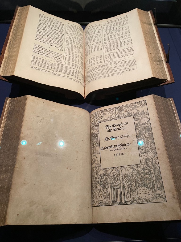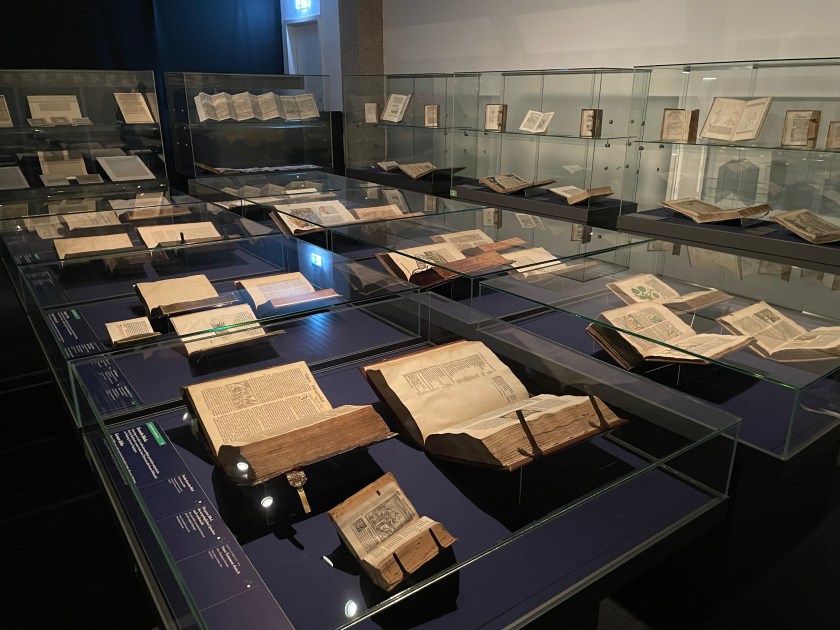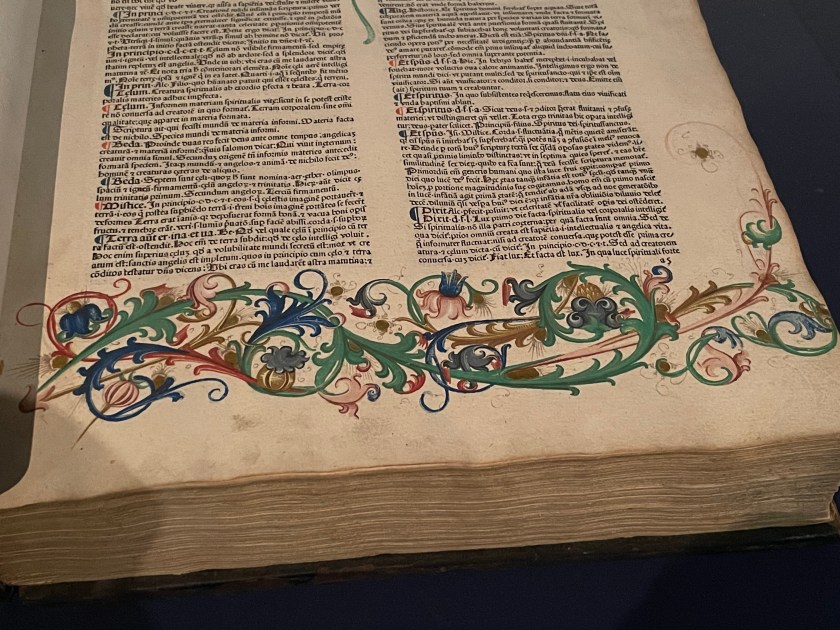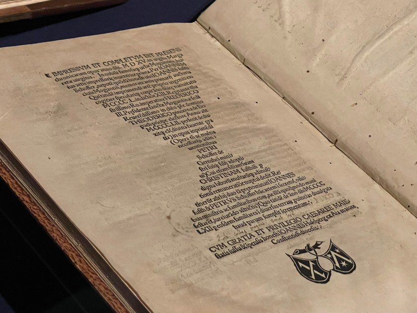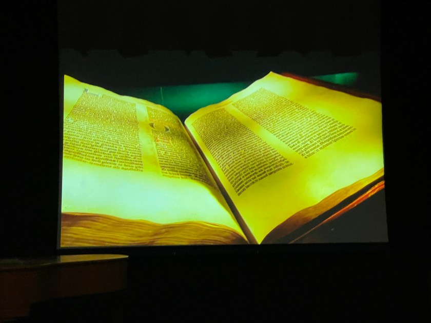 Original copies of Gutenberg’s Bible are kept in a vault where you can see them. This photo is taken of one of those Bibles in the film. (You’re not allowed to take photos in the vault.)