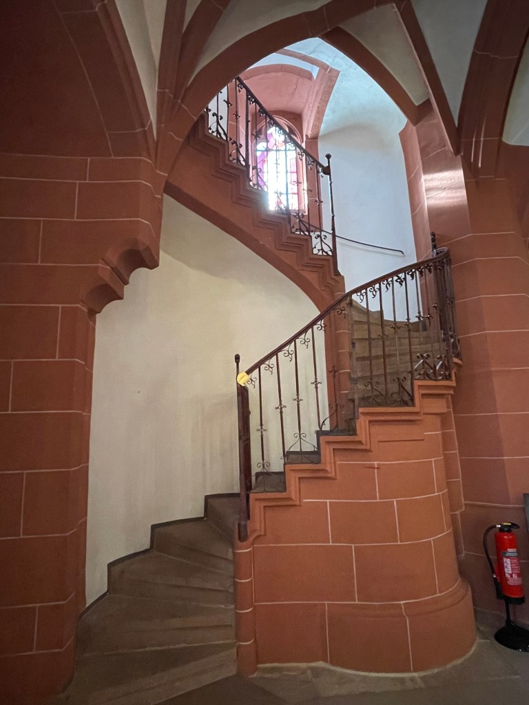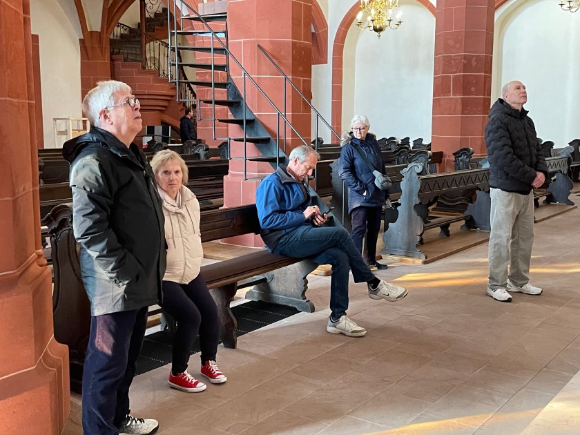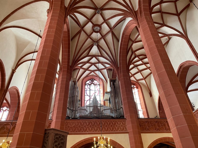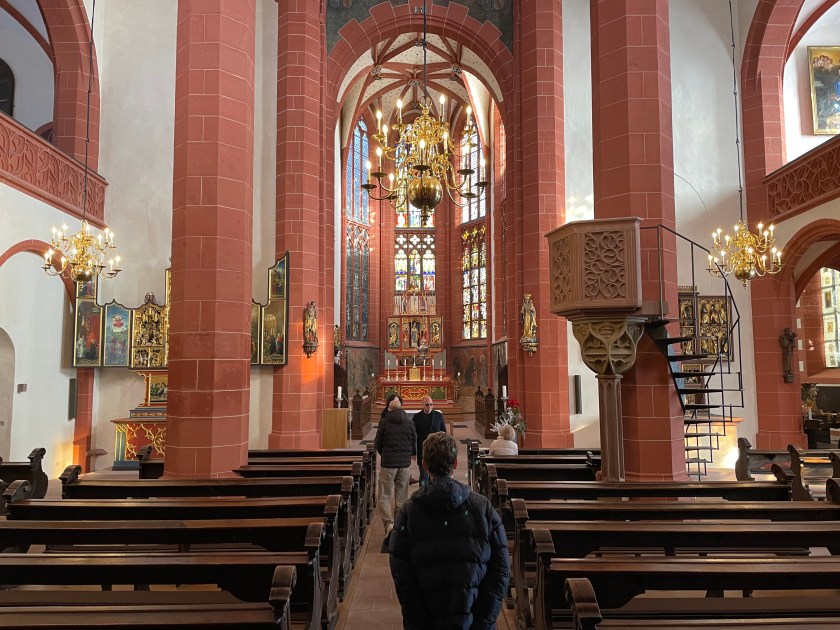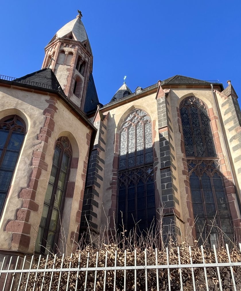 A few minutes down the street, along the river, our next stop was at St. Leonard’s church. St. Leonhard is a parish of the Roman Catholic Church in Frankfurt, dating back to 1219, when it was erected in the center of the town close to the river Main. It stands as a Romanesque-style basilica. From 1425, it was remodeled to a hall church in late Gothic style. Today it’s used by English-speaking Catholics. You can read lots more about it here.