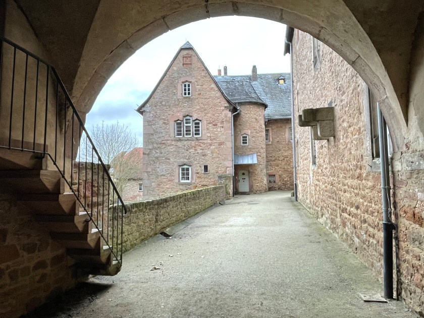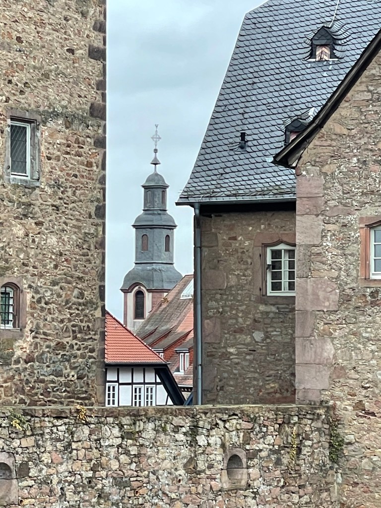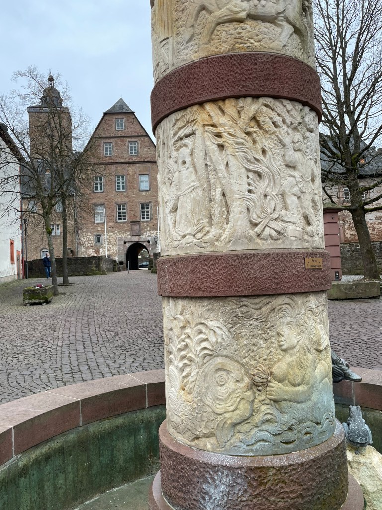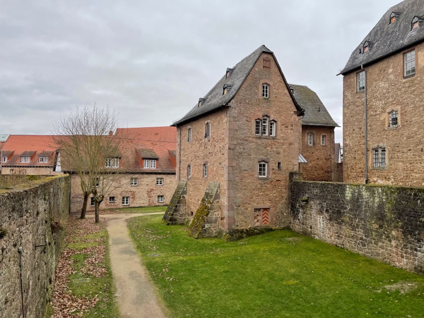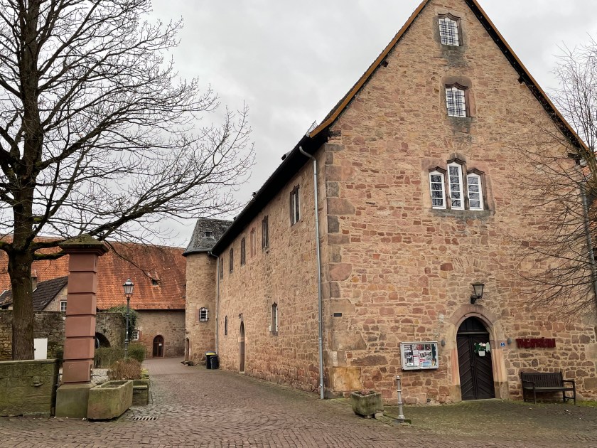 This city is known as Brüder-Grimm-Stadt and is half as big (population ca. 10,000) as Gelnhausen. We navigated to the castle and parked in free parking there. There were very few people out on the streets on this somewhat cold Saturday. We walked through the castle courtyards but will have to wait until March before seeing the inside where a special Grimm Brothers exhibit currently stands.