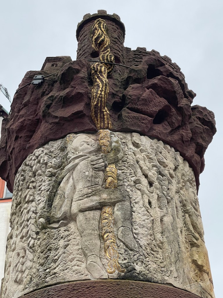The castle entrance was right off the main square, where we saw a fantastic fountain (Märchenbrunnen) memorializing some fun Grimm fairy tales, with Rapunzel in the castle at the top, her long golden hair flowing down to the prince who was climbing up.