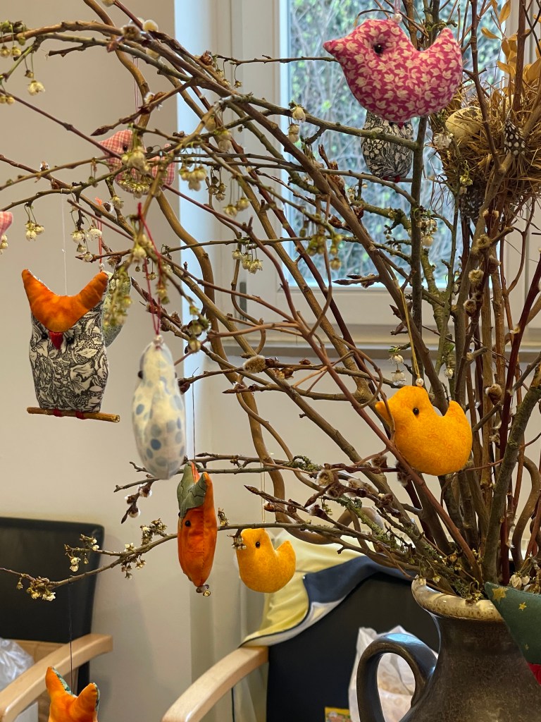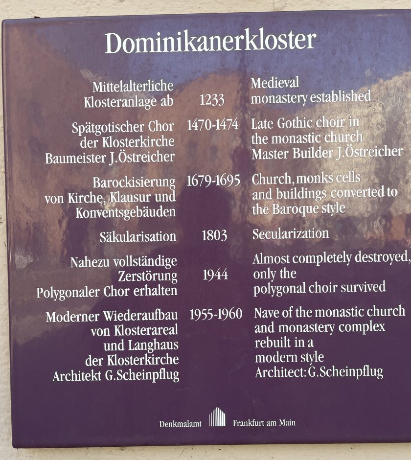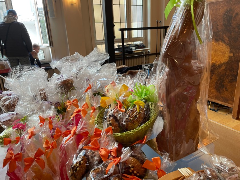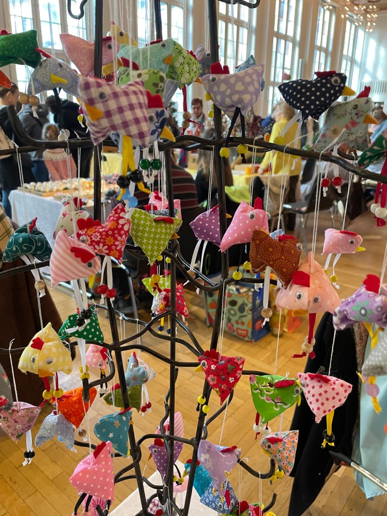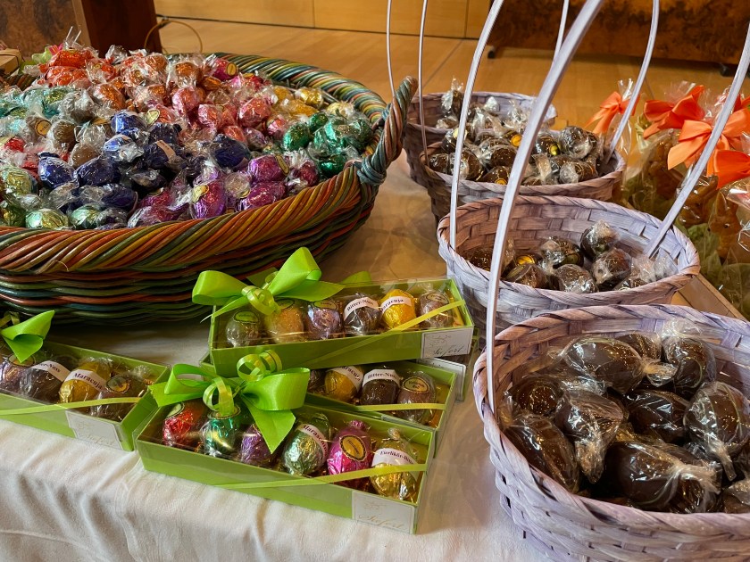 This afternoon we and the Romneys went into Frankfurt to the Dominican Kloster not far from the Dom for the Easter Market. These Easter Markets are scheduled in different towns this month–many of the same vendors travel to multiple markets, where they set up their tables to sell their wares.