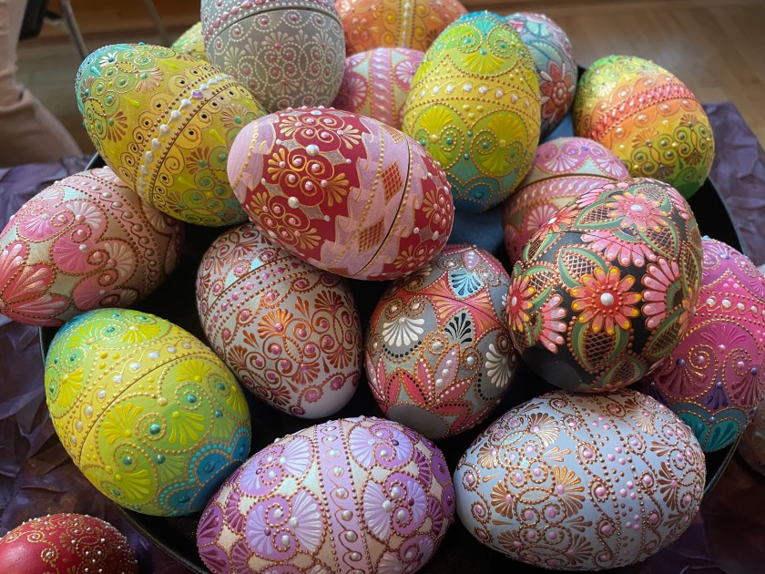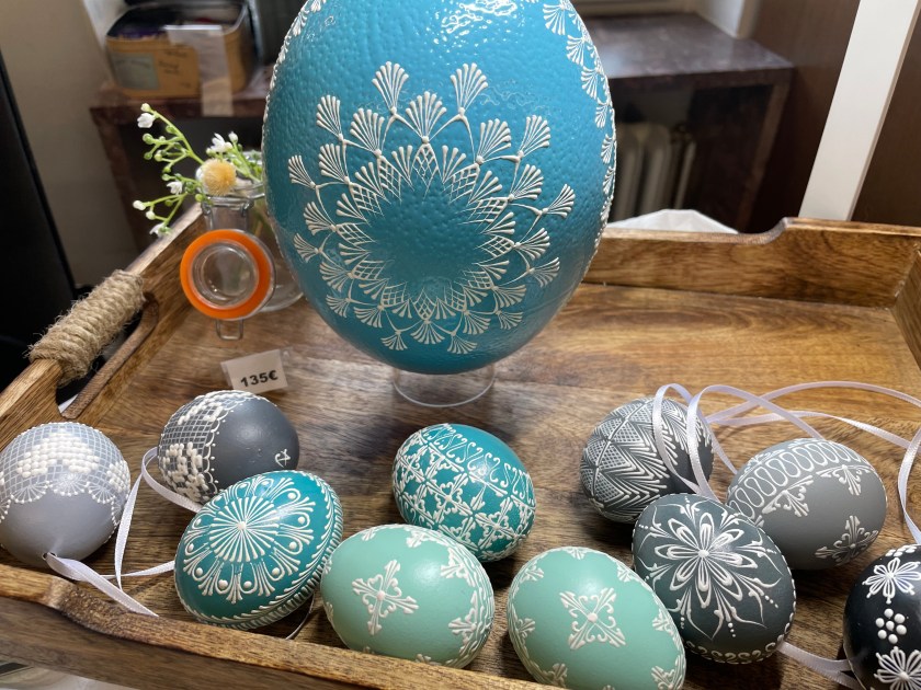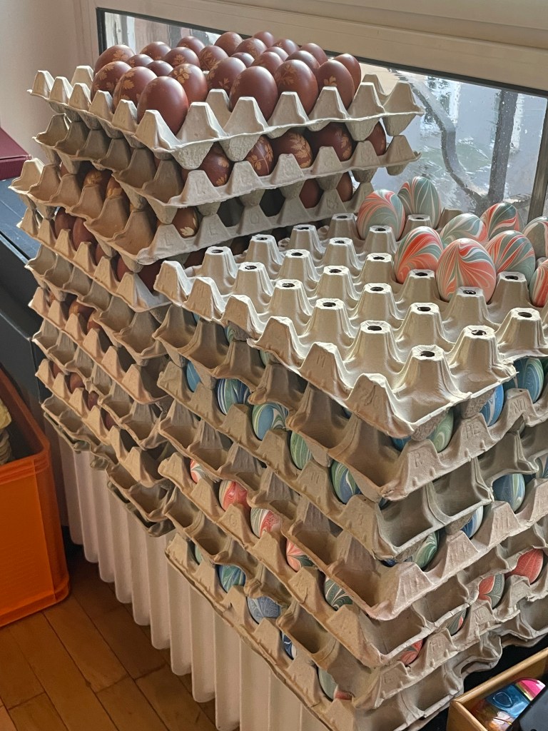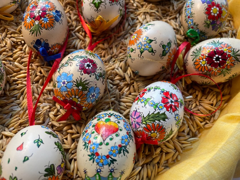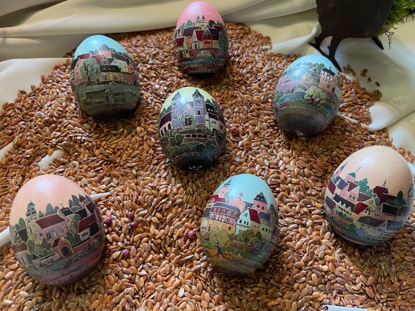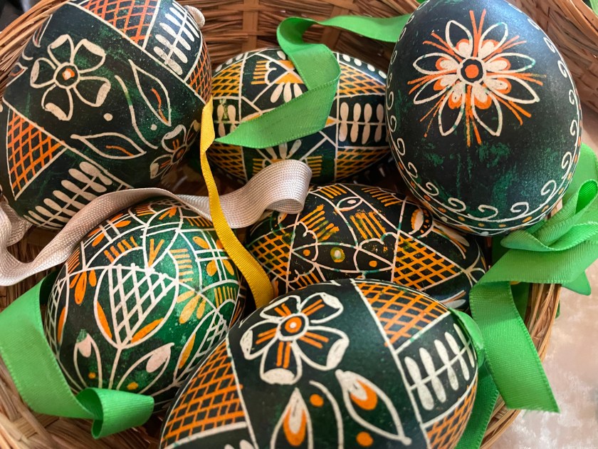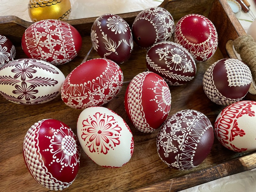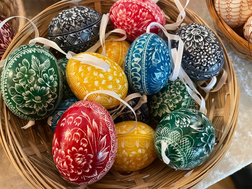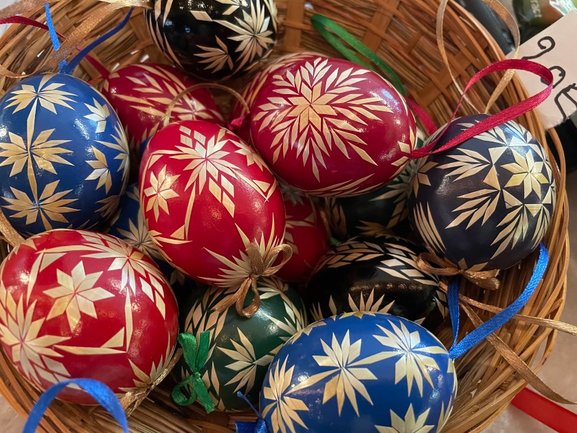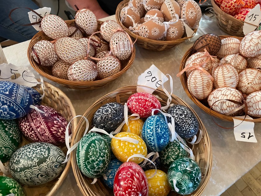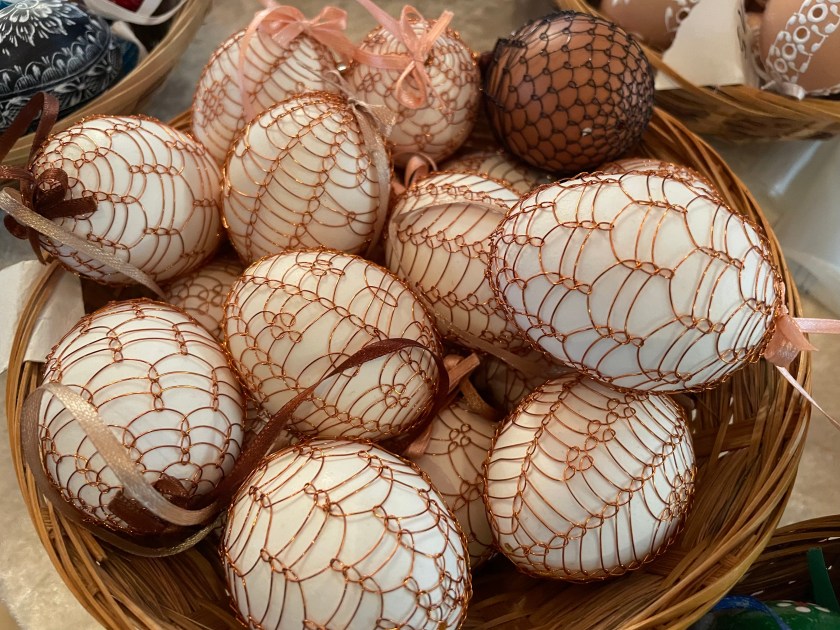 Ella picked out some of these naturally dyed eggs with leaf patterns on them. The woman explained how she uses onion skins to dye her eggs. And she proudly told us that she never wastes the egg she blows out of the shells. She shares the eggs with her family, neighbors and friends. She dyes them by the 100s.