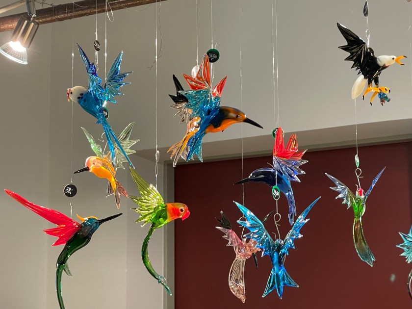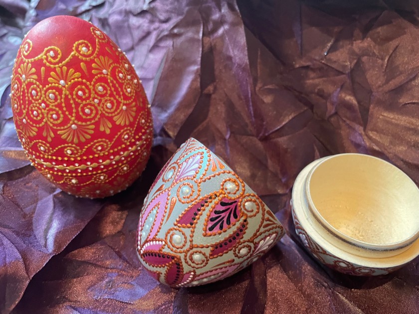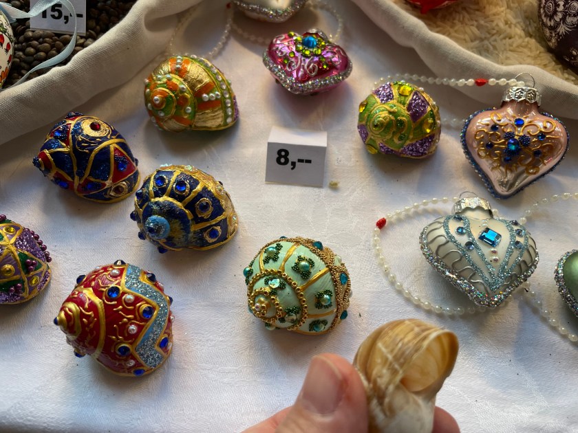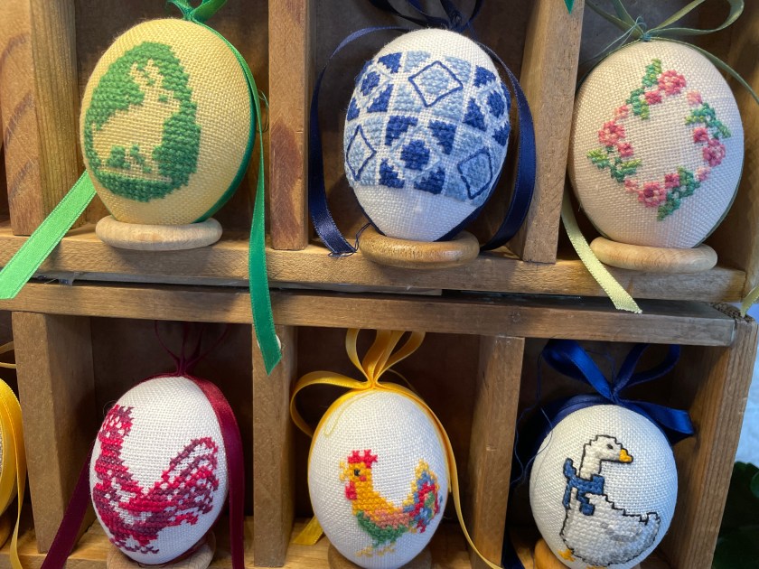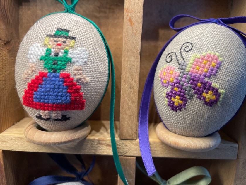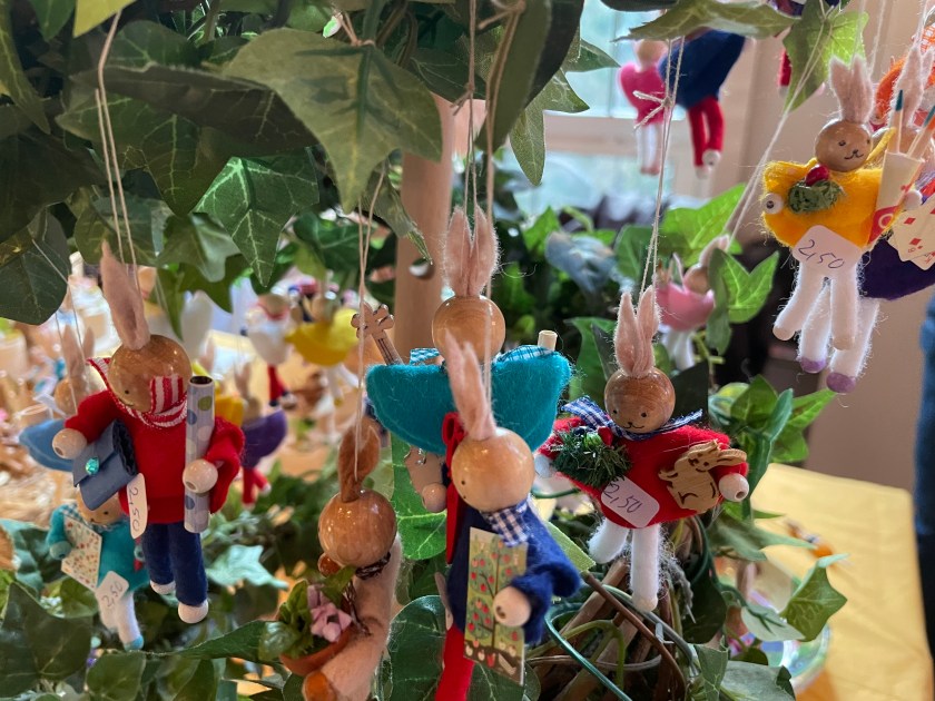 Many eggs were dyed, then the paint scratched off to reveal the white, with detailed patterns. We picked out enough to fill a bowl–8 eggs in different colors. I also picked out a few cute little Easter tree ornaments made with felted wool and felt. I like supporting these artists.
