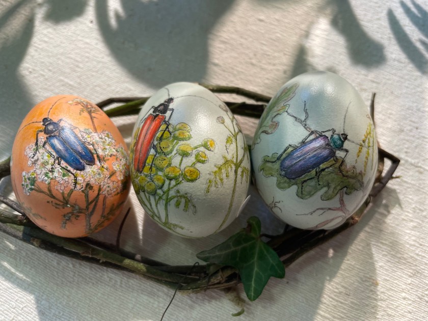 The eggs below were made with cut straw glued to the eggs, then painted with clear varnish.
