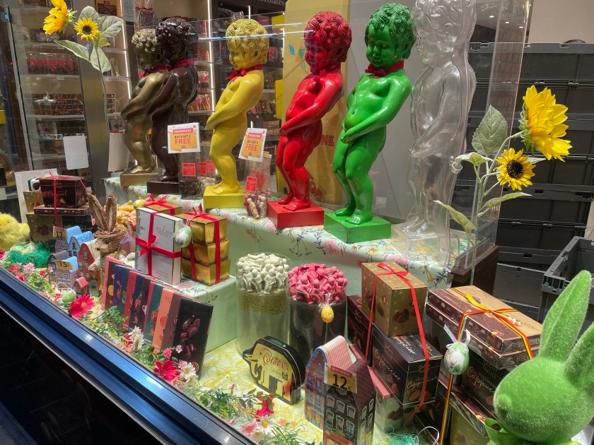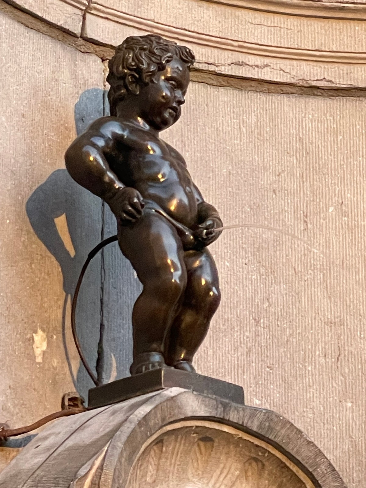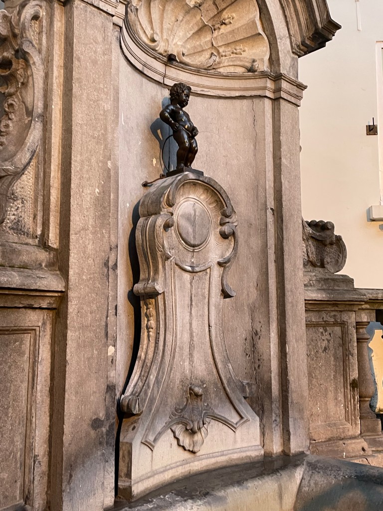 Manneken Pis, Dutch for ‘Little Pissing Man‘; is a bronze landmark fountain sculpture in central Brussels, depicting a naked little boy urinating into the fountain’s basin. Though its existence is attested as early as the mid-15th century, Manneken Pis was redesigned by the Brabantine sculptor Jérôme Duquesnoy the Elder and put in place in 1619. Its stone niche in rocaille style dates from 1770. The statue has been repeatedly stolen or damaged throughout its history. Since 1965, a replica has been displayed, with the original stored in the Brussels City Museum.