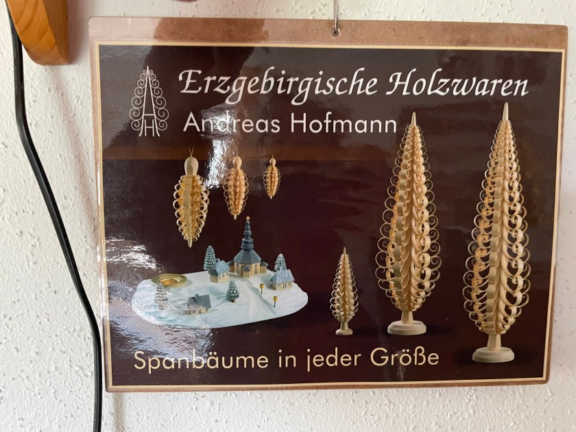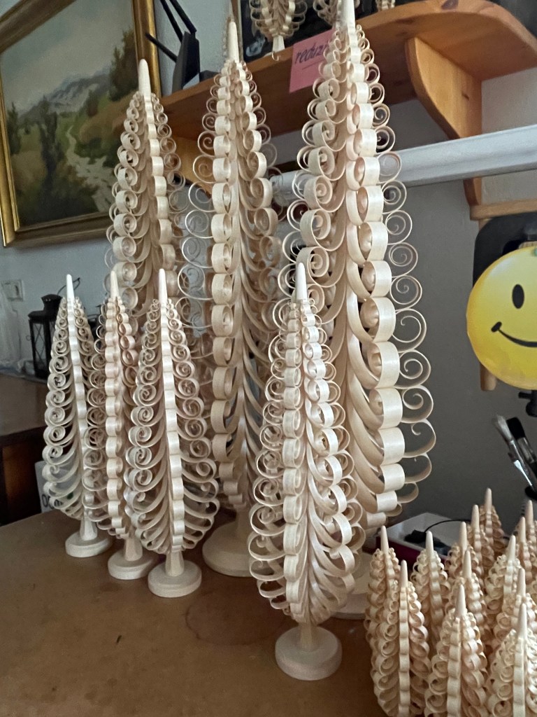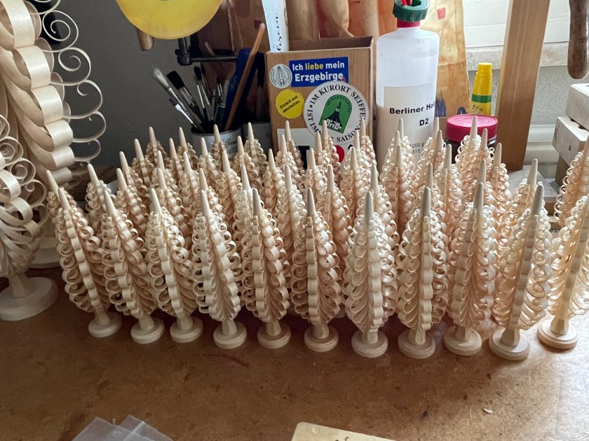 Andreas asked us if we wanted to see how he made these special trees. When I asked him how long it takes to make a tree, he said, “well, I cut the wood for these trees about a year ago.” The wood needs to age to just the perfect dryness so he can make the curls without breaking them. Andreas said he can make up to a hundred small trees in a single day. He sells these trees to other craftsmen who make the Christmas arches or the pyramids.