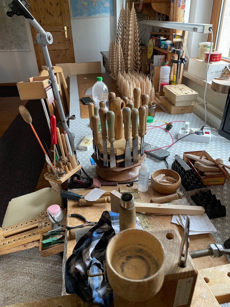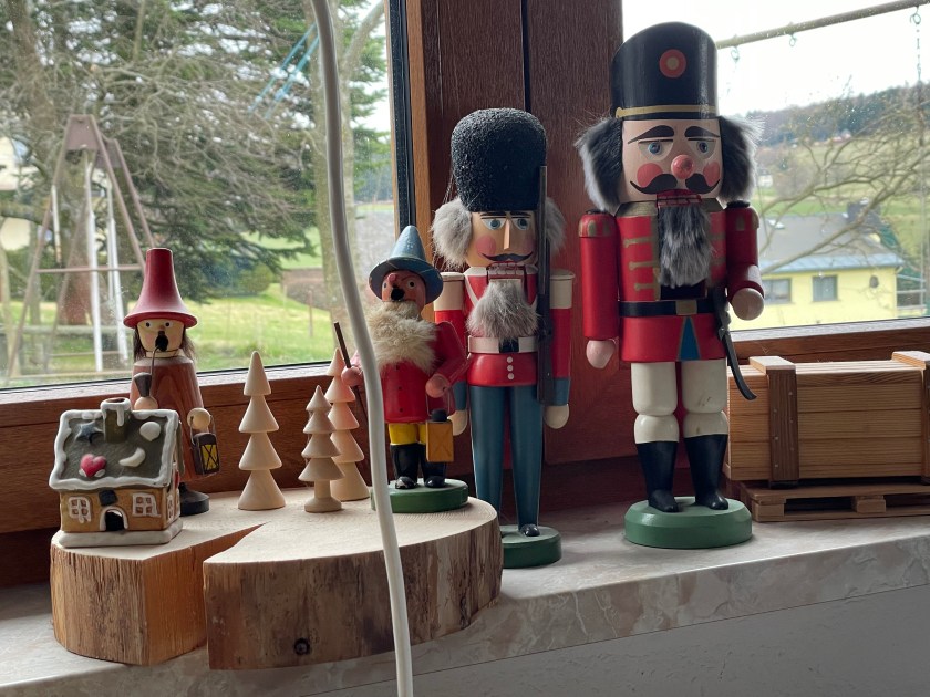 We noticed a home with a sign hanging out in front that indicated there was a woodcarver here. It said “Geoffnet,” so we knocked on the side door and we were welcomed in to the workshop of Andreas Hofmann. It was like going into a Santa’s workshop of sorts.