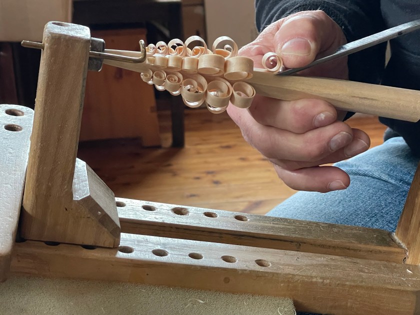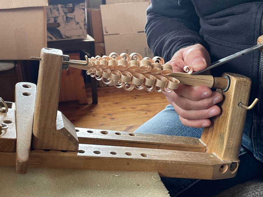 These are the dowels he makes to create the trees. Then he starts carving the curls, spiraling around and around.