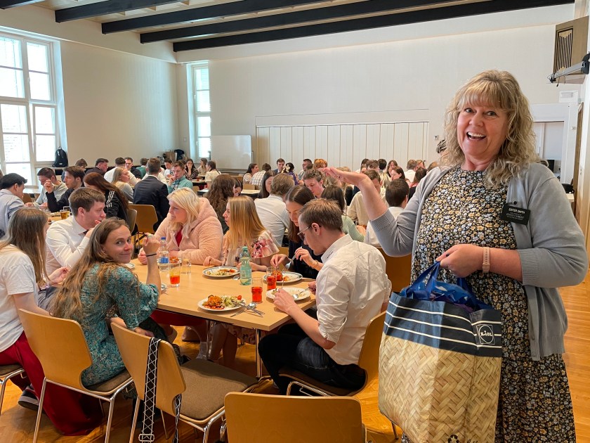 We drove to the Stake Center in Dresden this morning. It’s in a nice neighborhood near the Dresden Zoo. The homes there were big and stately, like mansions. The chapel was full when we arrived–full all the way to the back of the gym. We learned they were having a Young Single Adult Conference here this weekend with 160-170 youth.