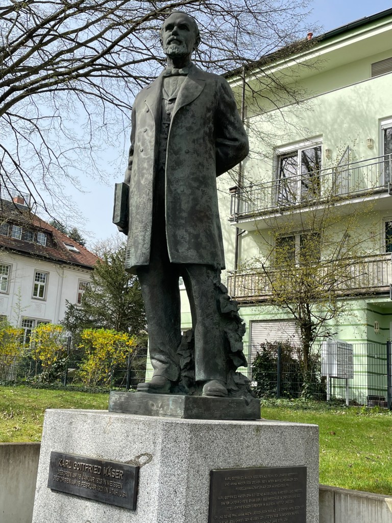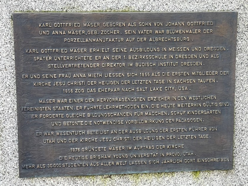Behind the church building in the parking area, there is a memorial to Karl G. Maeser, who was born in Meissen, a neighboring town. He emigrated to America, and to Utah, where he became the first principal of Brigham Young Academy, which later became Brigham Young University.