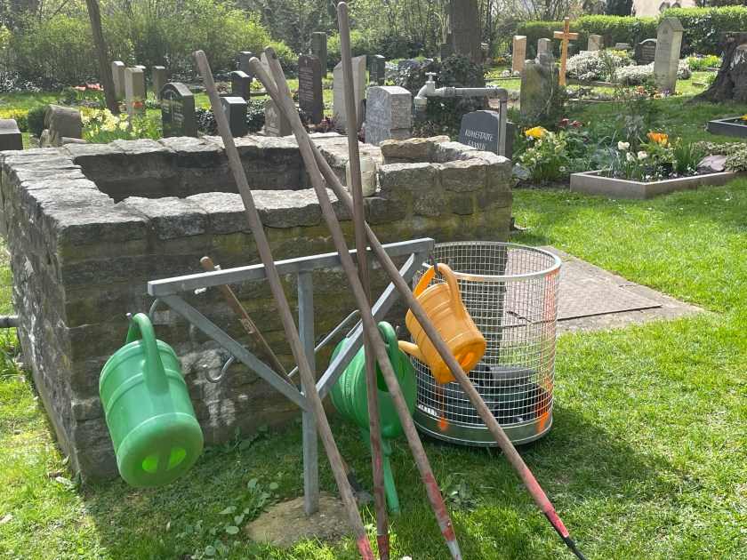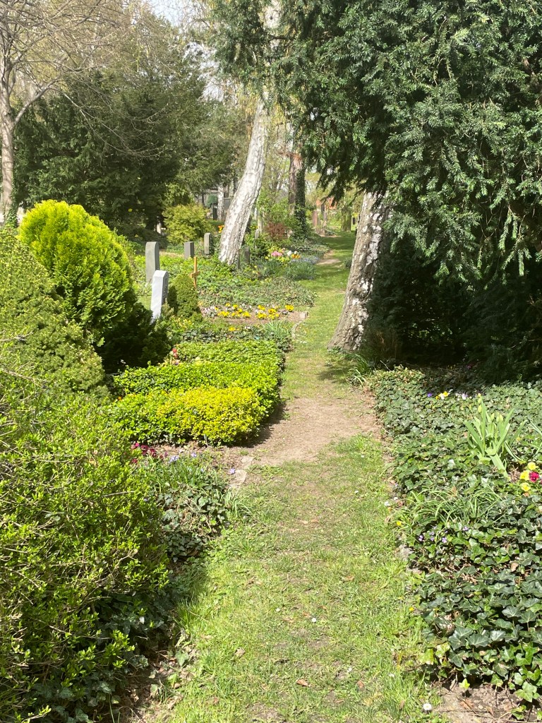 This is the Briesnitz Ev-Lutheran Kirche. It was very old, built of stone with beautiful spires that looked like crowns. It was situated in an old garden and cemetery. The church was locked up. The cemetery was quiet and beautiful, full of old trees and lots of ivy. Lilac bushes were almost ready to bloom. The old garden plots were still kept up, many with spring flowers–pansies, daffodils, and primroses. It was so peaceful. We walked around the Friedhof and church, thinking about Easter and the glorious resurrection that awaits.