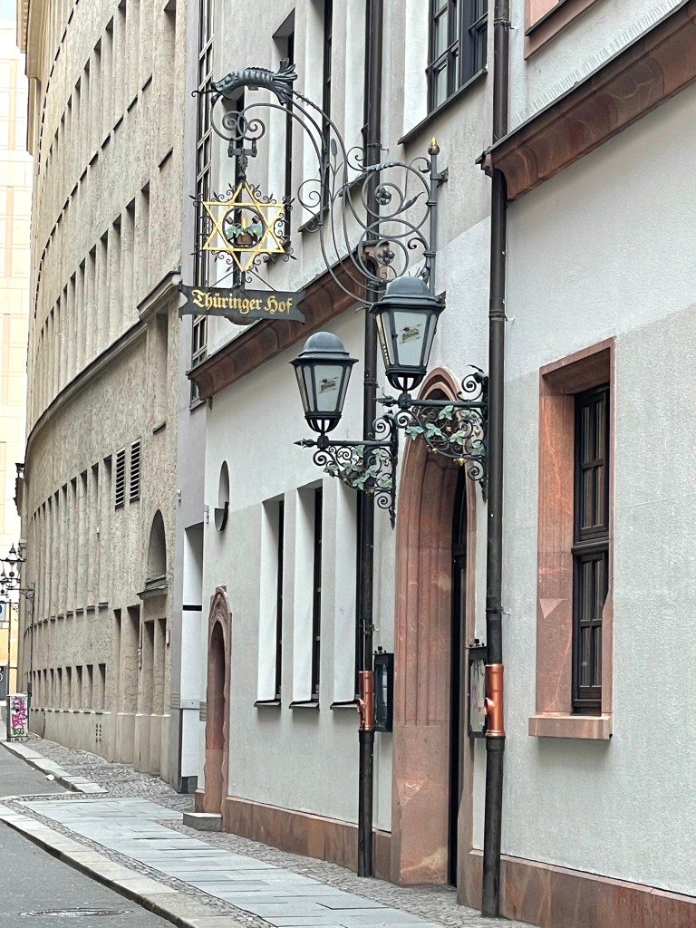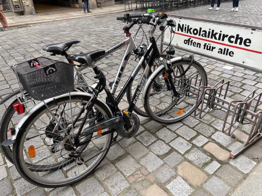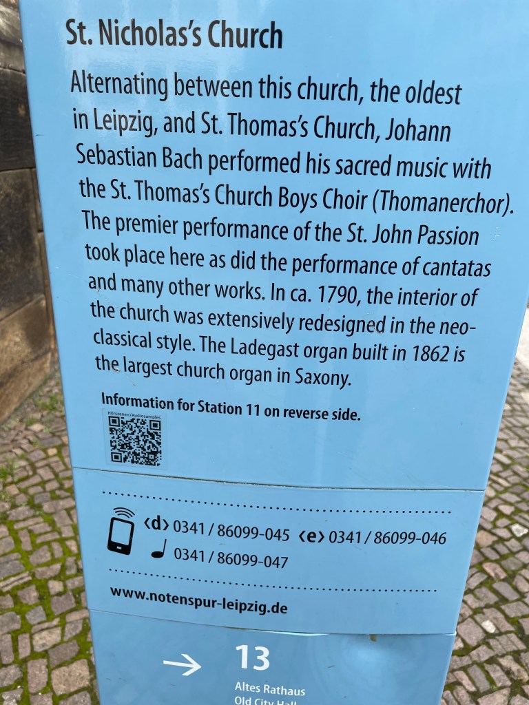 This is the St Nikolai church that was only open this morning, so we missed going inside. Bach also played and performed here. When Bach died at the Johann Hospital he was buried at the St. Nikolai church. When it burned down some years later, they identified and took Bach’s bones in a wagon/wheelbarrow to the St. Thomas Kirche to be buried there. Now they’re in a crypt inside the St. Thomas Kirche (under the floor in the choir section.