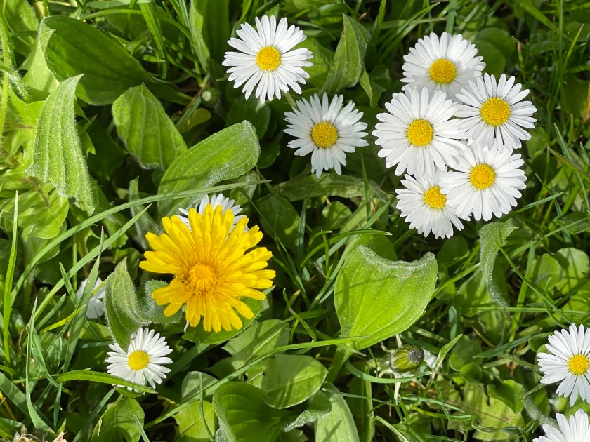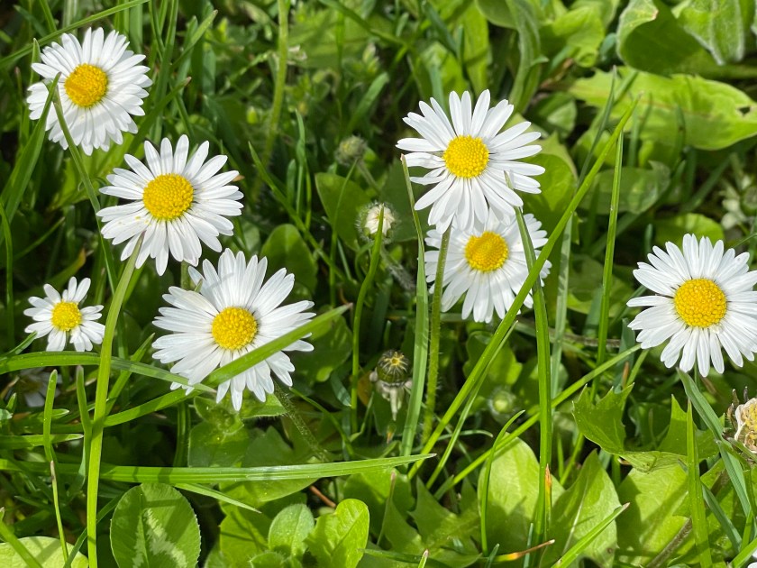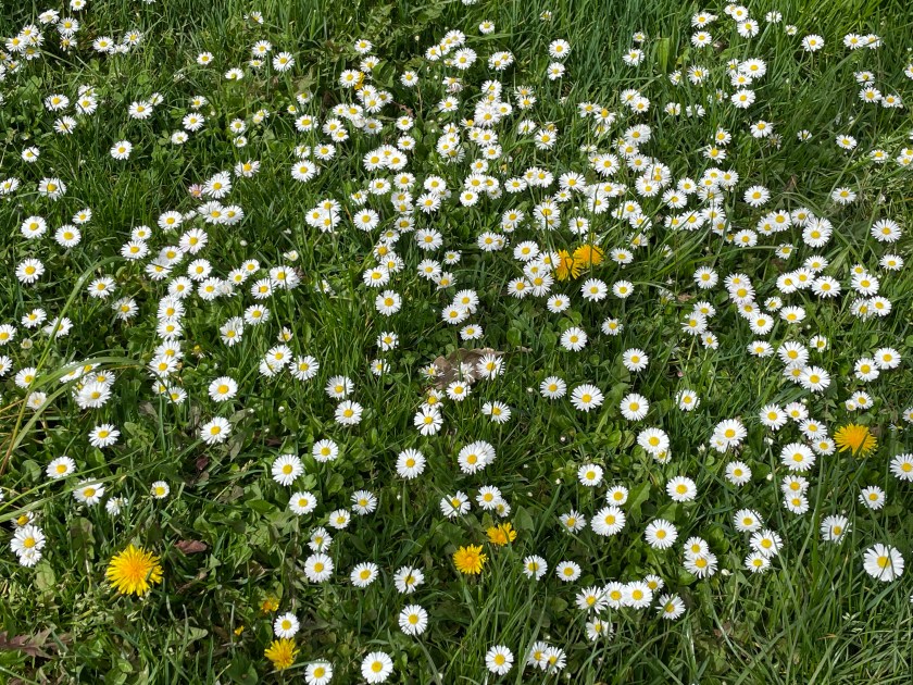 So far, in any place we’ve seen, the grass (in yards or fields) is not yet mowed. These beautiful little daisies are growing everywhere.